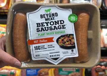 Un paquete de salchichas vegetales de Beyond Meat. En vídeo, declaraciones del consejero delegado de la compañía, en Nueva York.