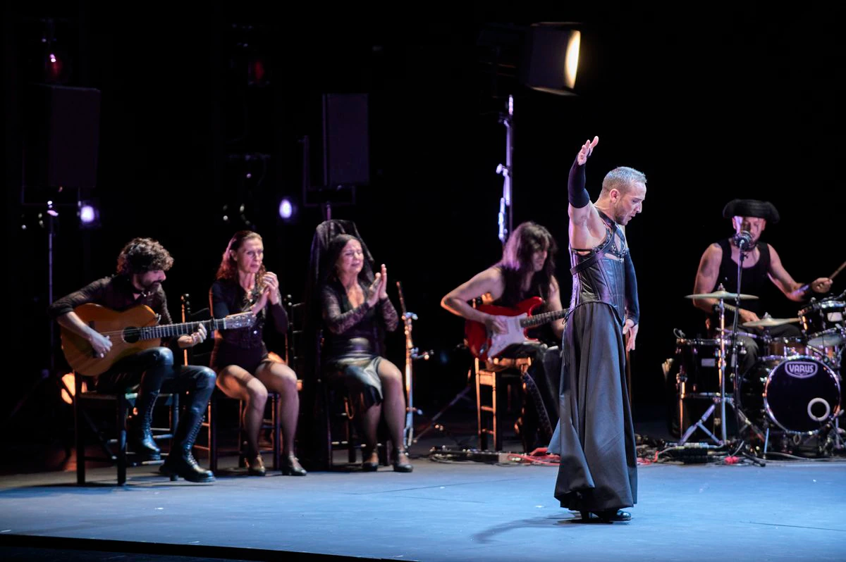 En el papel del padre estaba la figura del cantaor tradicional (que anoche corrió a cargo de David Carpio). El drama comenzaba con el padre subido a una gran atalaya con forma de burladero al que Liñán, ataviado con coderas y rodilleras y acompañado de los ritmos metálicos de la guitarra eléctrica de Víctor Guadiana y la batería de Jorge Santana (en un estilo que recordaba a bandas como Dream Theater pero que encuentra un paralelo ineludible en el trabajo de Lagartija Nick), golpeaba rabiosamente. Arriba, Carpio interpretaba impertérrito unas soleares que disonaban armónicamente de la música de Guadiana y Santana. Junto a batería y guitarra eléctrica, en el escenario, la guitarra flamenca de Juan Campallo, el violín, también, de Víctor Guadiana, y los jaleos y compás de Ana Romero y Tacha González, que, ataviadas de puta y manola, hacían las veces de piedades de Liñán.