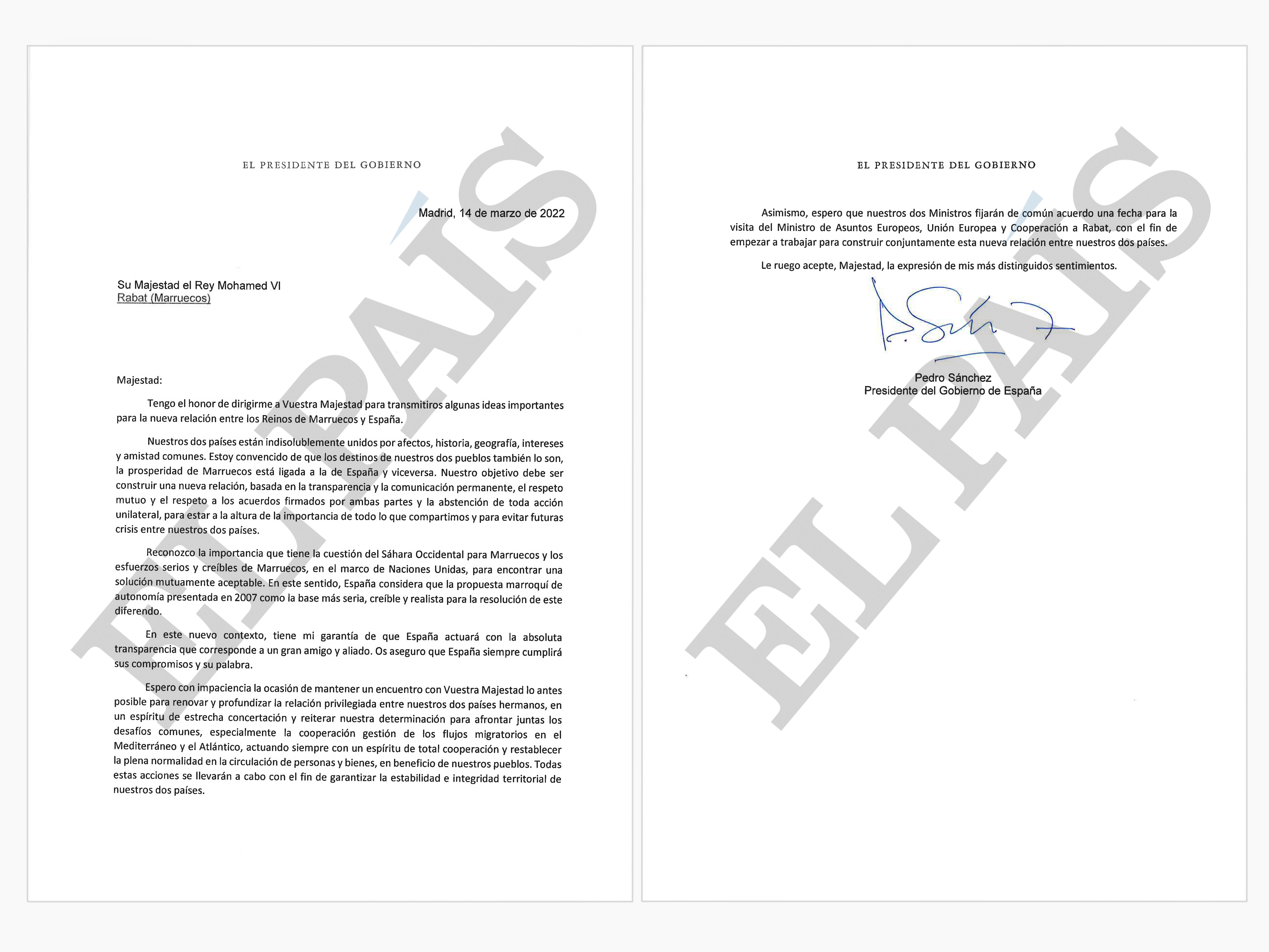 “Tengo el honor de dirigirme a Vuestra Majestad para transmitiros algunas ideas importantes para la nueva relación entre los Reinos de Marruecos y España”. Así se inicia la carta que el presidente del Gobierno, Pedro Sánchez, dirigió al rey Mohamed VI, anunciándole el giro en la posición del Gobierno español respecto al Sáhara, a la que ha tenido acceso EL PAÍS. La misiva está fechada el lunes 14 de marzo, cuatro días antes de que la Casa Real marroquí la hiciera pública parcialmente el viernes por la tarde. En un texto breve —poco más de un folio, seis párrafos, además de la despedida—, Sánchez repite hasta en tres ocasiones su propósito de inaugurar una “nueva relación” entre los dos países, tras una crisis diplomática que se ha prolongado durante 10 meses. Y plantea a Marruecos abstenerse de “toda acción unilateral” para evitar “futuras crisis” entre ambos.