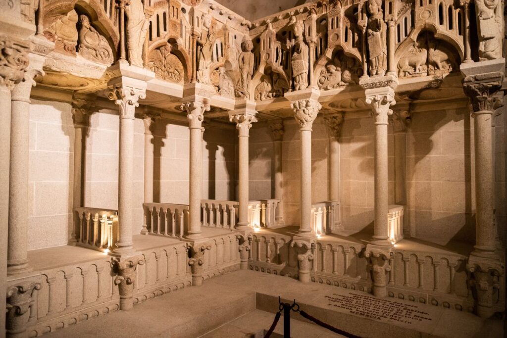 Aunque muchas de esas piezas románicas, como las esculturas de la primitiva fachada que protegía el Pórtico, corrieron otra suerte y cambiaron varias veces de manos (dos de ellas fueron a engrosar el patrimonio privado de Francisco Franco), otras jamás abandonaron el templo. Están en él, embutidas de incógnito en muros, cimientos y pavimentos, o a la vista en fachadas, pero sacadas de su contexto. Es el caso de muchos fragmentos del coro, pero también de otras obras de arte que hasta ahora nadie sospechaba que existiesen, como la serie de relieves polícromos que representan, con toda su brutalidad, el pasaje de la matanza de los inocentes.