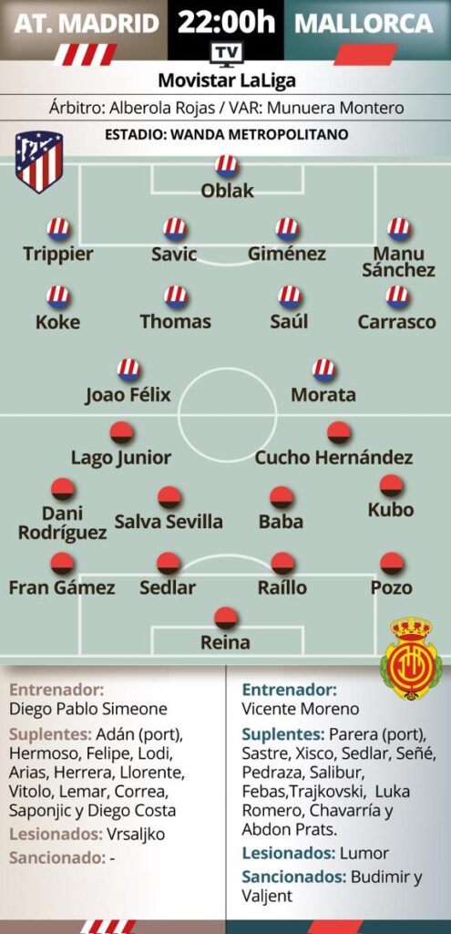 Volviendo a Morata, el delantero se reencontrará con Salva Sevilla, con quien en la primera vuelta protagonizó una agria polémica tras er expulsado. El andaluz está siendo uno de los motivos de Mallorca para creer en este tramo final del campeonato y, obviamente, fijo para Vicente Moreno, que ya ha anunciado rotaciones para el Metropolitano.