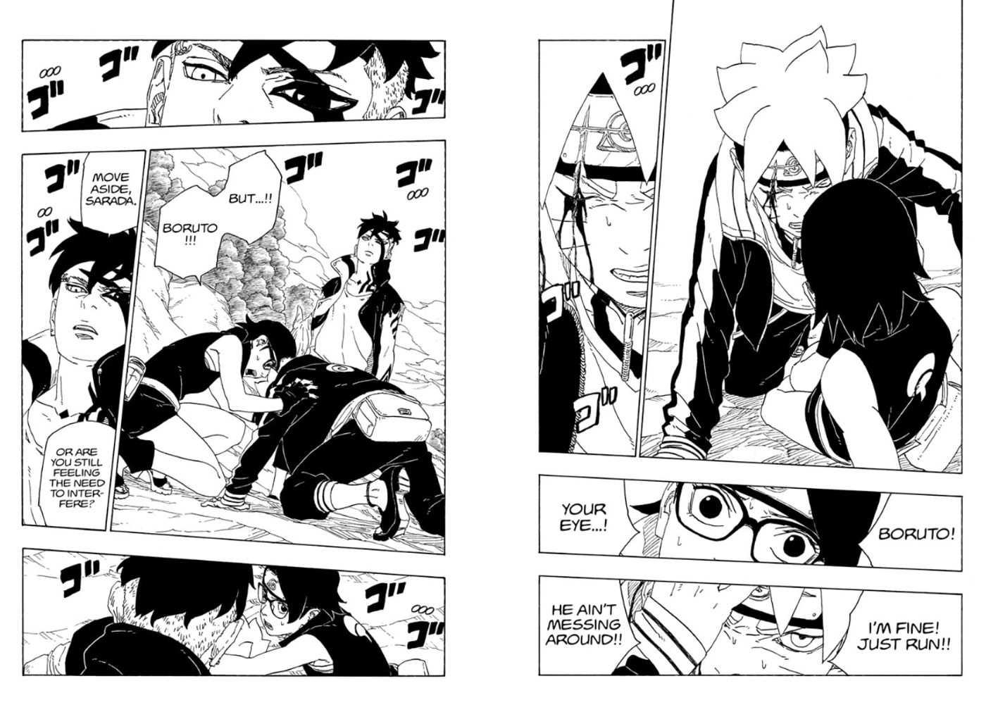 “/> Sarada, que acaba de enterarse de que Boruto fue asesinado (y luego resucitado) por Kawaki durante su batalla contra Code, interviene para salvar a su amiga. Sin embargo, Kawaki la domina y está a punto de cortarla cuando Boruto salta y empuja a Sarada fuera del camino, dejando una desagradable cicatriz en su ojo y mejilla derechos en el proceso.