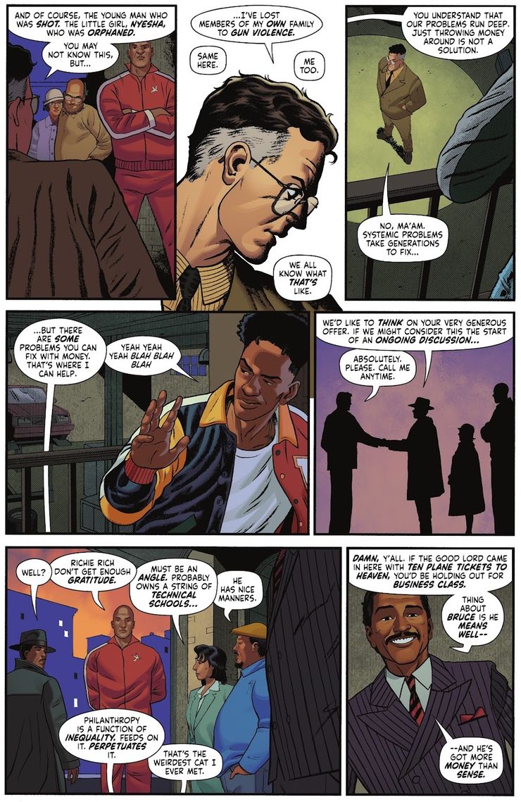 La desigualdad de ingresos de Gotham ha creado una gran brecha socioeconómica, y en un entorno donde los pobres se sienten olvidados por los ricos, es comprensible que sospechen de las verdaderas intenciones de Bruce. Dent reflexiona después de la conversación que Bruce tiene una conciencia terriblemente culpable, pero eso no lo hace querer por la gente de Burnside en lo más mínimo. Bruce puede ser un filántropo en la continuidad de los cómics actuales (hasta que perdió todo su dinero), pero aún vive en una mansión muy visible con un leal mayordomo a su lado. Es posible que ni siquiera se dé cuenta de que su condición de multimillonario es inherentemente parte de un sistema que los residentes de Burnside condenan.