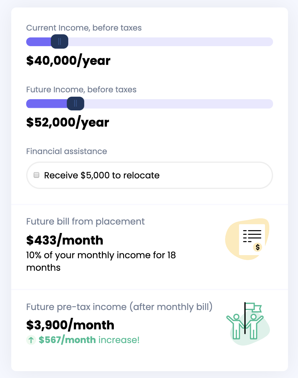 Por ejemplo, Placement tiene como objetivo ayudar a alguien que gana $ 40,000 por año antes de impuestos a alcanzar $ 52,000 sobre una base ajustada por costo de vida. Terminarían pagando Colocación $ 7,794 en el transcurso de 18 meses, o $ 433 por mes. Después de la factura, seguirían ganando $ 3,900 por mes, o $ 567 más de lo que solían hacerlo. Si toman el estipendio de reubicación de $ 5,000 y asistencia adicional, su ISA se extiende a 36 meses y terminarán pagando un total de $ 15,588, incluido el estipendio.