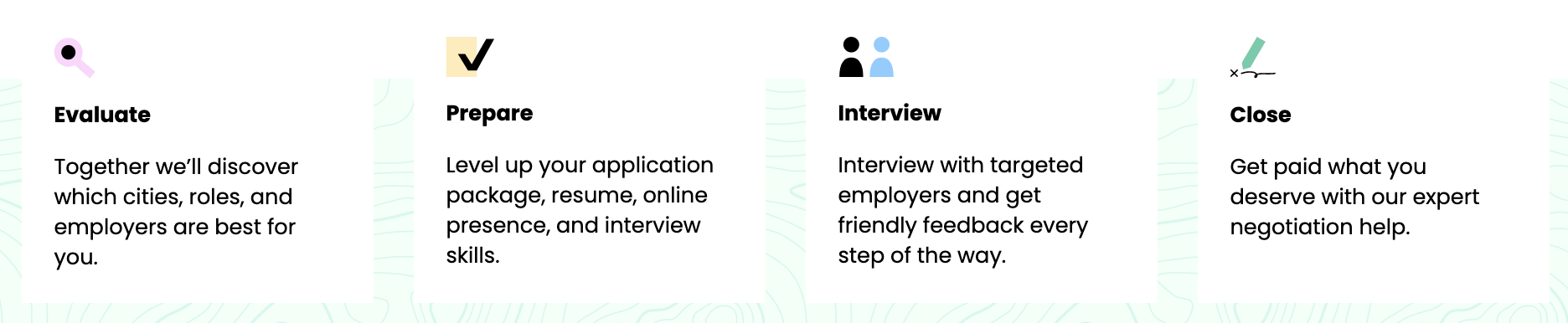 Una vez que han seleccionado algunos objetivos, Placement respalda su proceso de preparación, ayudándoles a mejorar su LinkedIn y su currículum, practicar contando su historia y ofrecer entrevistas simuladas con expertos en su campo. A medida que avanzan en las entrevistas, Placement establece y requiere que los contratantes ofrezcan de forma remota, enseña a los clientes a negociar para obtener la mejor compensación posible.