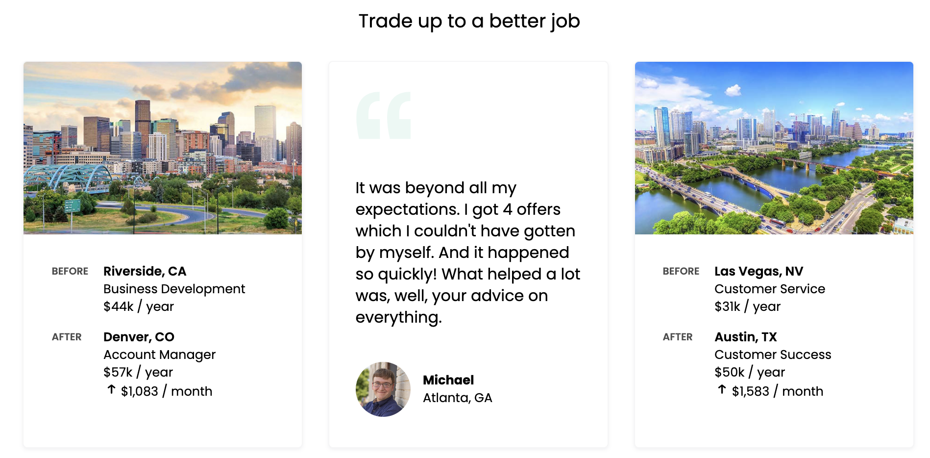 Primero, la startup recluta a través de publicidad dirigida y referencias de boca en boca, que la compañía dice que el 100% de los clientes han proporcionado. Principalmente, está buscando profesionales de negocios con una habilidad que no coincida con su ciudad, como ventas, recursos humanos u operaciones en un lugar sin empresas que compitan para contratar esos roles. Es posible que nunca hayan abandonado su ciudad natal o regresado después de la escuela en una universidad de nivel medio, suprimiendo su potencial de ingresos. Pero la falta de conocimiento sobre la búsqueda de empleo, los temores de abandonar su red de apoyo o la falta de fondos para financiar una mudanza los mantienen atrapados allí.