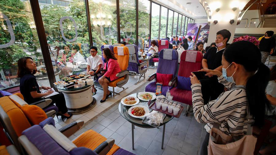 El restaurante, habilitado con auténticos sillones de vuelo y situado en las oficinas de Thai Airways, en el norte de la capital tailandesa, se llenó este viernes de clientes que accedieron por una escalerilla como si subieran a una aeronave.