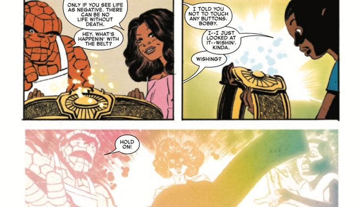 En solo cuatro números, Ben ha podido adquirir dos dispositivos misteriosos pero poderosos que ha utilizado durante la serie. El cinturón de teletransportación y el vial de luz que otorga fuerza le han dado a Ben una ventaja sobre el resto de sus contrapartes de los Cuatro Fantásticos. Ni Sue, Reed ni Johnny pueden igualar los poderes de los artefactos por sí solos, y mucho menos cuando se agregan a las habilidades superpoderosas que The Thing ya posee.