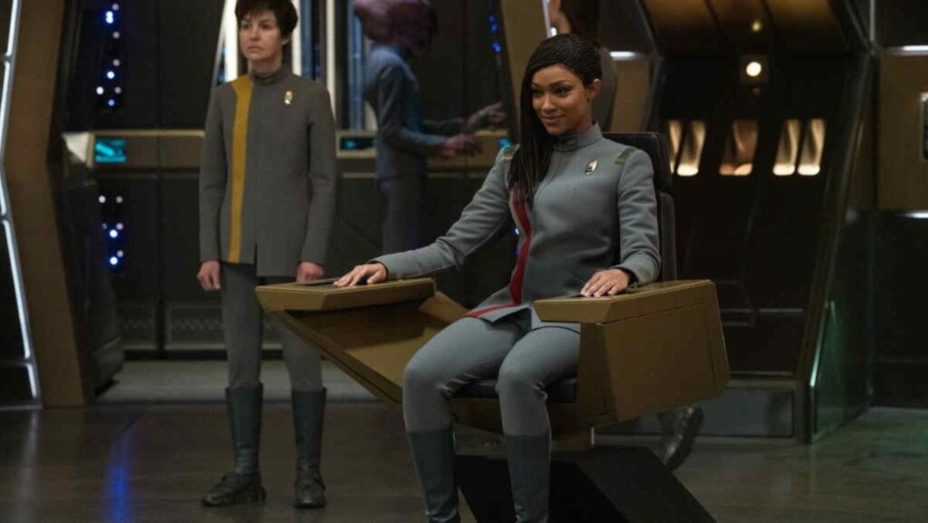 “Eso es algo muy importante para mí”, dice Martin-Green acerca de que Burnham finalmente se convirtió en capitán. “Ser capitán ahora de esa franquicia se solidificó al timón de ese barco en la historia de la franquicia como mujer negra, enorme para mí y, en general, para la franquicia en sí”.