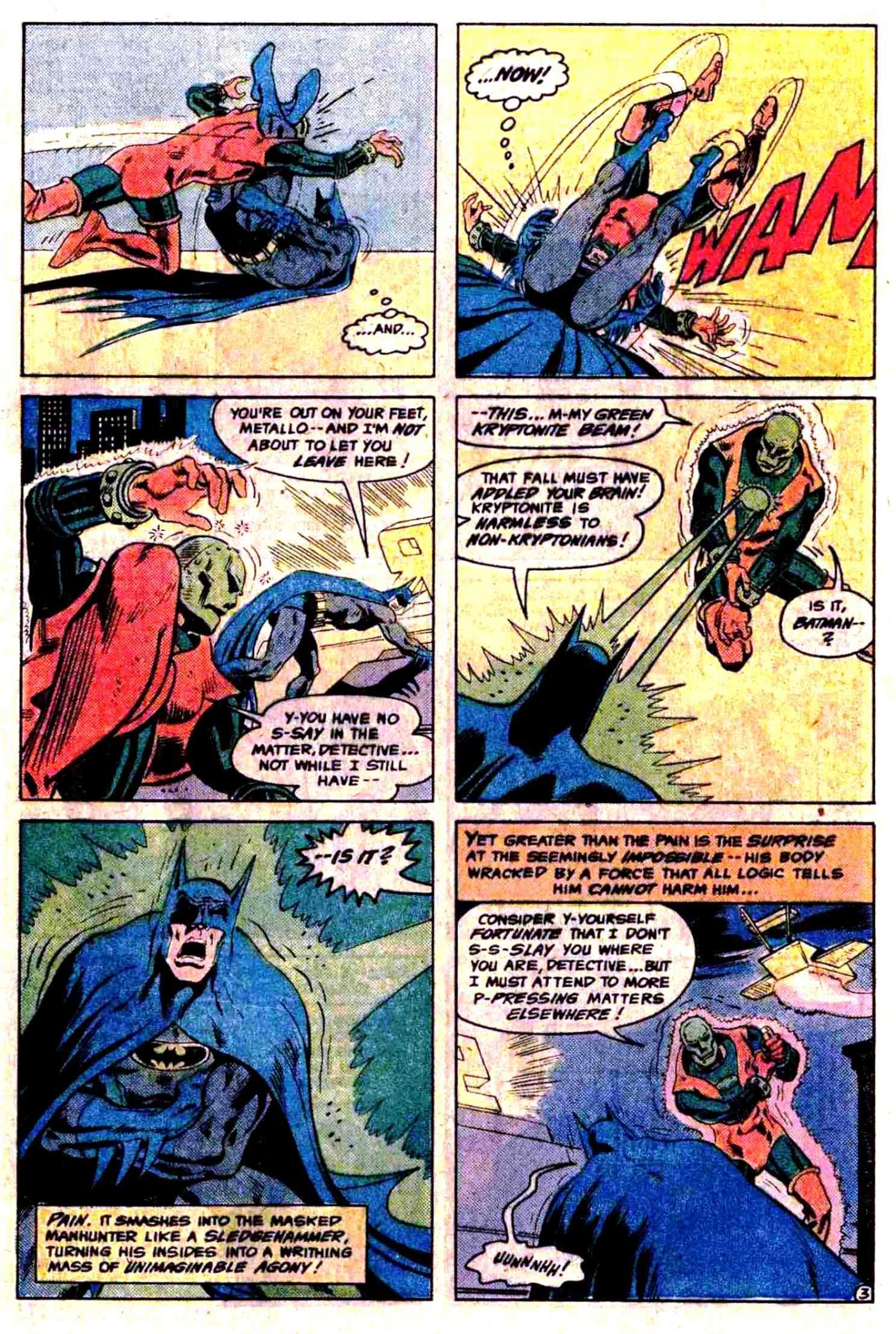 Batman intenta reírse al principio, pensando que Metallo debe estar confundido. Sin embargo, ya no es divertido cuando Batman es abrumado por un dolor intenso y cae al suelo mientras Metallo se ríe. Si bien Batman está preparado para casi todo, esta exposición a la kryptonita casi resultó su perdición.