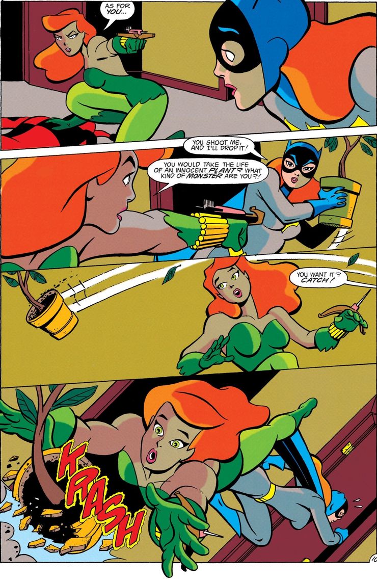 En “Batgirl: Día Uno” (Aventuras de Batman #12) por Kelley Puckett y Mike Parobeck, Harley Quinn y Poison Ivy irrumpen en una fiesta para secuestrar a la hija del jefe de una corporación responsable de horribles crímenes contra el medio ambiente. La niña que los villanos pretendían secuestrar, Sandy, estaba en una habitación trasera del lugar de la fiesta vigilada por guardias de seguridad. Pensando que puede haber problemas en marcha, Batgirl, que también está presente, va a ver cómo está cuando, de repente, Harley Quinn y Poison Ivy atraviesan la seguridad y se dirigen a la ubicación de Sandy, lo que provoca que Batgirl entre en acción. Después de incapacitar rápidamente a Harley Quinn, Batgirl agarra una planta en una maceta que se colocó cerca como decoración y amenaza con aplastarla contra el suelo a menos que Poison Ivy se rinda. Mientras Ivy la regaña por poner en peligro la vida de una planta inocente por su conflicto, ella no retrocede, por lo que Batgirl arroja la planta y Poison Ivy se sumerge para atraparla. Una vez que Ivy bajó la guardia, Batgirl pudo llegar a Sandy antes que ella, frustrando efectivamente su plan.