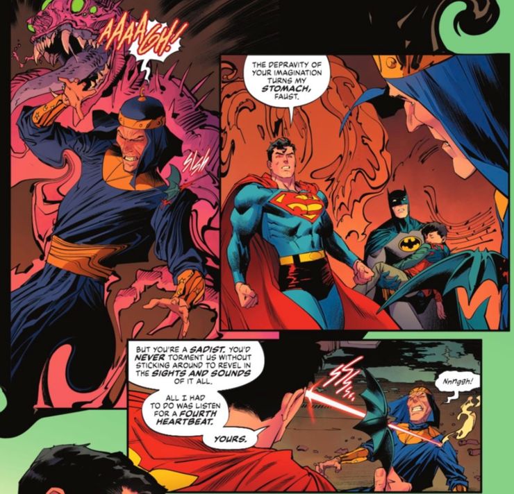 Y si bien es cierto que Superman no puede superar la magia por completo, eso no significa que no pueda burlar a las personas que la usan. Clark demostró cómo puede vencer al notorio mago oscuro Felix Faust en Batman/Superman: Los mejores del mundo #3 por Mark Waid y Dan Mora. Faust ha atrapado a Batman y Superman en un infierno literal, completo con fuego y demonios. Batman se siente abrumado por la experiencia e implora a Superman que haga algo. El Hombre de Acero pide silencio con calma mientras agarra un batarang. Antes de que nadie sepa lo que sucedió, Superman lo lanza y le da un golpe directo a Faust, poniendo fin a la pesadilla. Clark le dice a Faust que sabía que el villano no dejaría pasar la oportunidad de ver sufrir a sus enemigos, así que todo lo que tenía que hacer era escuchar un latido que no le pertenecía.