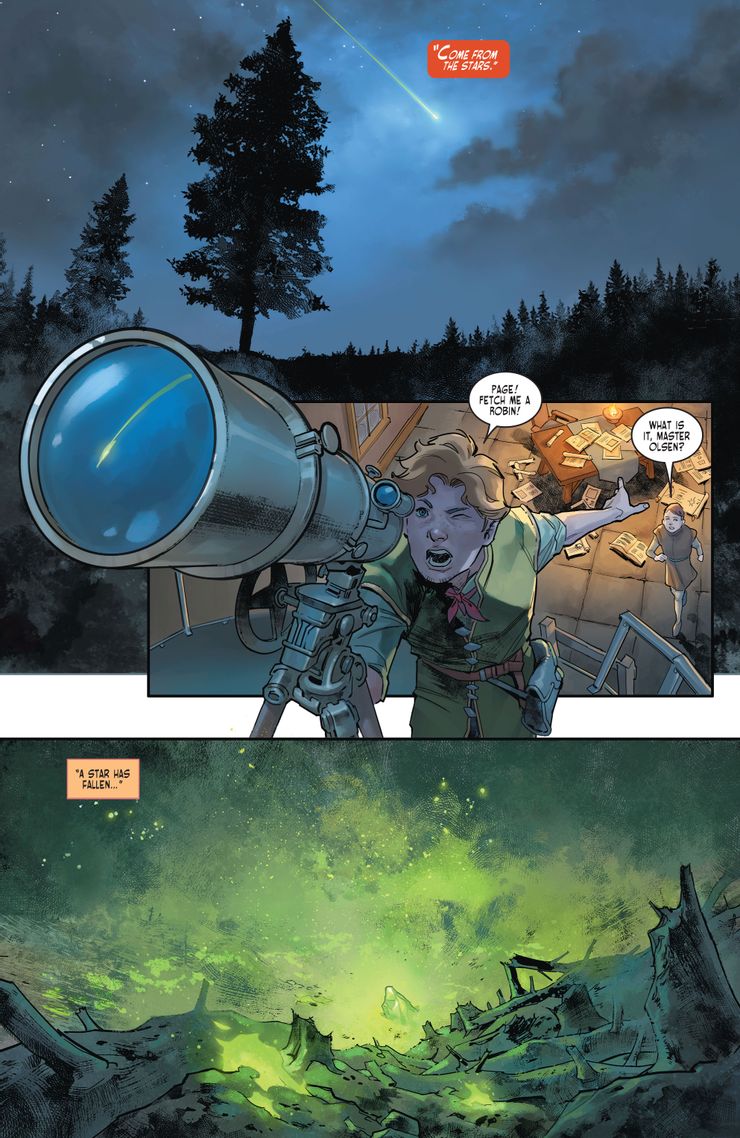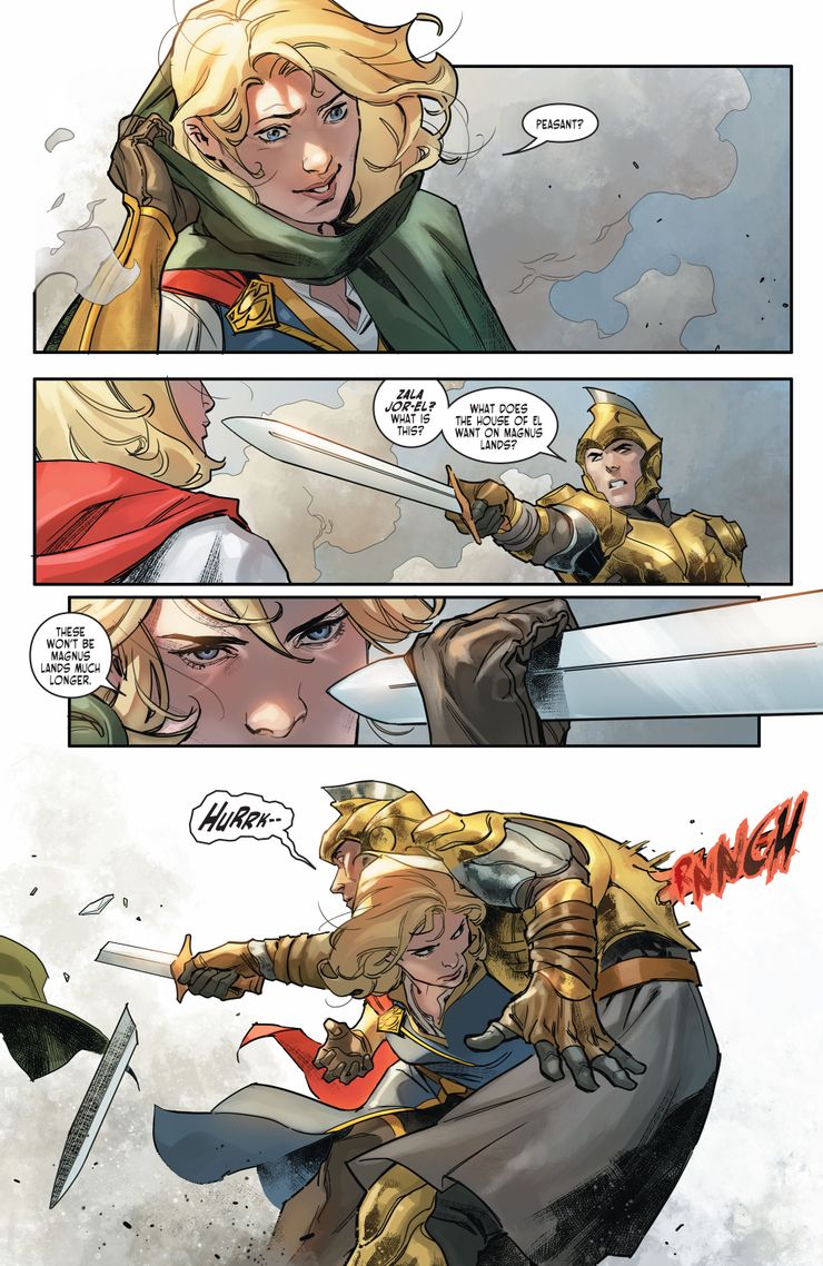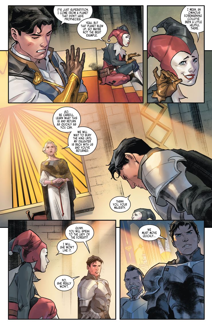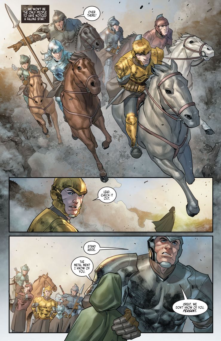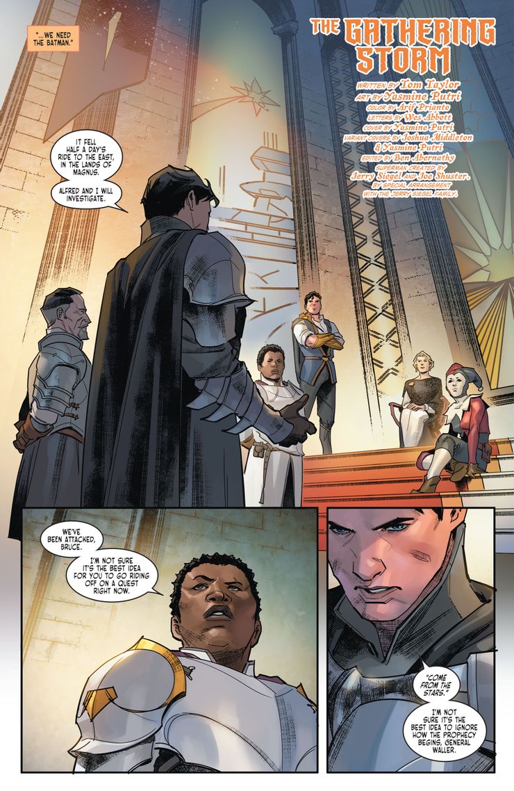 Una vista previa de Dark Knights of Steel # 3 de Tom Taylor, Yasmine Putri, Arif Prianto y Wes Abbott comienza con una explosión cuando el amigo de Superman, Jimmy Olsen, mira las estrellas. Ha cambiado su equipo de fotografía por un telescopio y es testigo de una extraña caída de rocas desde el cielo, lo que hace que su escudero llame la atención del ejecutor de la Corte de El, el Bat-Príncipe. La llegada envía ondas de choque a través del reino, con Bruce tomándose la llegada en serio, notando que cierta profecía comienza con las palabras “vienen de las estrellas. “La gente de la tierra ya ha tomado nota de la llegada del objeto celeste, como los Hombres de Metal que aparentemente lo buscan antes de ser detenidos por la hermana de Kal-El, Zala Jor-El.