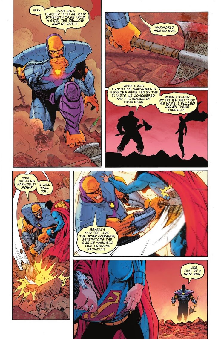 Se sabe que Superman se alimenta de los efectos de la kriptonita en ocasiones, pero si bien la radiación solar roja no lo matará, esencialmente lo convierte en un humano mortal como Batman, con todas las debilidades inherentes a la especie. Esto convierte a Superman de una amenaza casi inmejorable en alguien que podría perder contra un luchador entrenado, siempre que elijan la ubicación cerca de un gigante rojo. Dado que el maestro de Mongul conoce esta debilidad, y presumiblemente la aprendió de otra persona, esto hace que Superhombre mucho más fácil de derrotar en los confines del espacio.