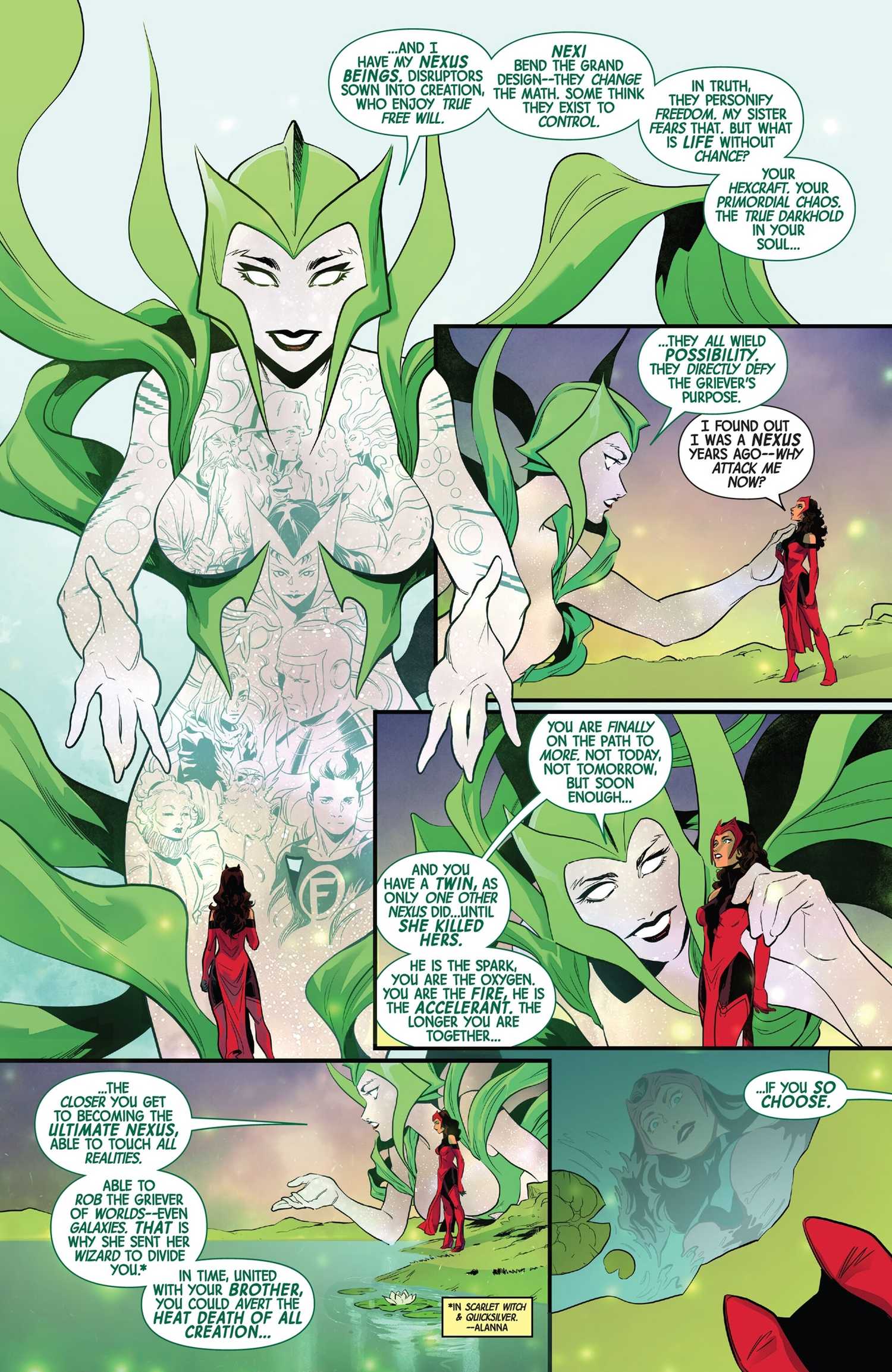 bruja Escarlata #2 – de Steve Orlando y Jacopo Camagni – pone a Scarlet Witch cara a cara con la Reina de Nevers en la Tierra de los Muertos, quien explica que ella aprovecha el poder a través de seres nexus en todo el multiverso, incluida Wanda. Sin embargo, a diferencia de la mayoría de los nexi, Scarlet Witch es especial porque es gemela. Los dos comparten una conexión que, en última instancia, la prepara para convertirse en Ultimate Nexus cuanto más tiempo permanezca con Quicksilver.