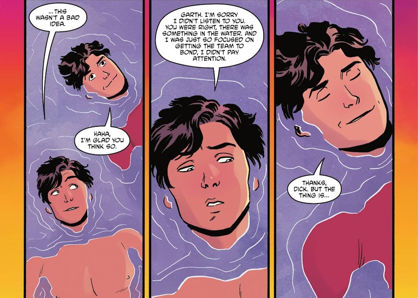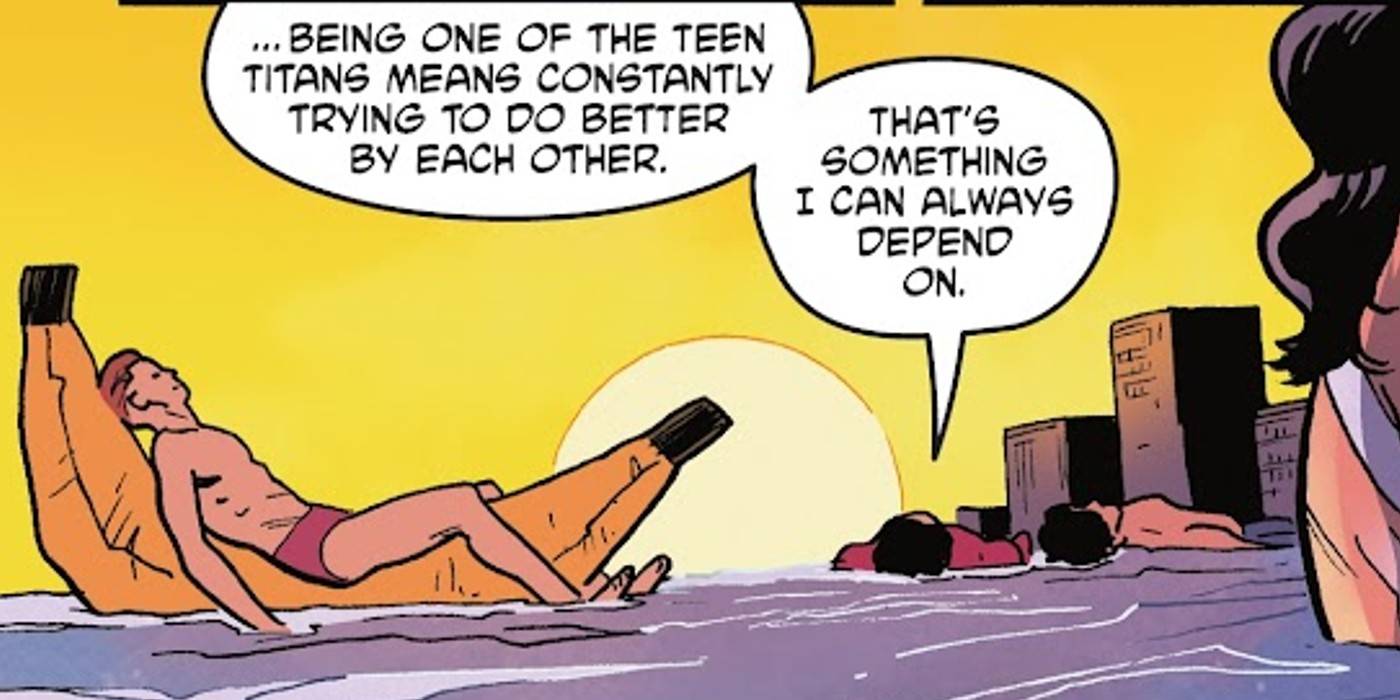 Garth toma con calma la disculpa de Robin y le recuerda a Dick su declaración de misión: “…ser uno de los Jóvenes Titanes significa intentar constantemente mejorar unos con otros. Eso es algo en lo que siempre puedo confiar”.
