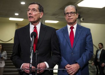 Los senadores John Barasso (izquierda) y Mike Braun (derecha). En vídeo, los aliados de Trump presionan para cerrar esta semana su juicio político. AFP