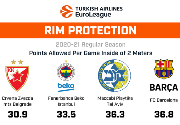 Como se deduce inicialmente de los puntos encajados por partido, el Barça se erige como la más eficiente defensa de la Euroliga al paso por la jornada 15 de competición. Profundizando más en esta capacidad, el buen nivel de los azulgrana se basa sobre todo en la capacidad para proteger la cercanía del aro y conceder bajo porcentaje de acierto en tiros de dos.