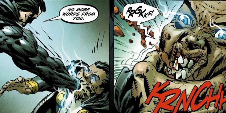 En los cómics de DC Siempre mal El evento cruzado de Geoff Johns, David Finch y Richard Friend, Ultraman y la toma de posesión de la Tierra-0 por parte del Crime Syndicate estaba en pleno apogeo. Pero, durante uno de los ataques de Ultraman, Black Adam intervino y reveló sus intenciones de destruir al malvado Superman, ya que era una amenaza para el planeta. Black Adam se las arregla para lanzar algunos golpes poderosos a Ultraman diciendo “Shazam”, pero después de darse cuenta de que estaba lastimado con las palabras, el villano agarró la boca de Adam y la aplastó como una uva.