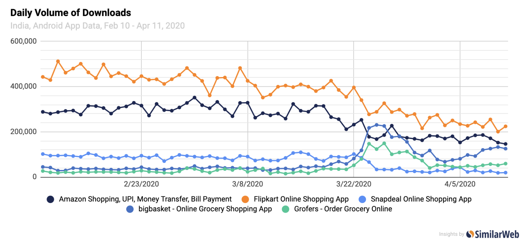 Las aplicaciones de entrega de comestibles BigBasket, que recaudaron $ 60 millones la semana pasada, y Grofers han aumentado considerablemente, mientras que Amazon, Flipkart y Snapdeal, que han dejado de tomar pedidos no esenciales en las últimas semanas, han visto una disminución en el volumen de descargas diarias y usuarios activos en Android en India, según la firma de investigación de mercado SimilarWeb.