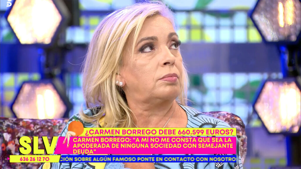 El consultor ha irrumpido en el plató del programa de las tardes de Telecinco para desvelar una noticia que ha dejado a Borrego petrificada: “En los registros figura como morosa”, comenzaba explicando, para después añadir que “tiene una deuda con la Agencia Tributaria que asciende a 660.599 euros”. Unas palabras que han pillado totalmente desprevenida a Carmen, que no daba crédito a lo que el profesional le estaba contando y se defendía como podía: “No tengo ni idea de lo que está hablando. Desde hace años que no estoy en ninguna sociedad. No soy apoderada de ninguna sociedad ni tengo ningún inmueble. A mí no me pueden embargar nada porque no tengo nada”, admitía, tajante y firme en sus convicciones.