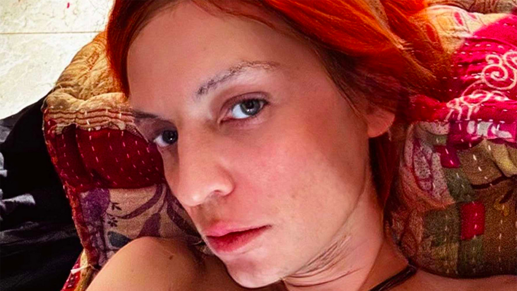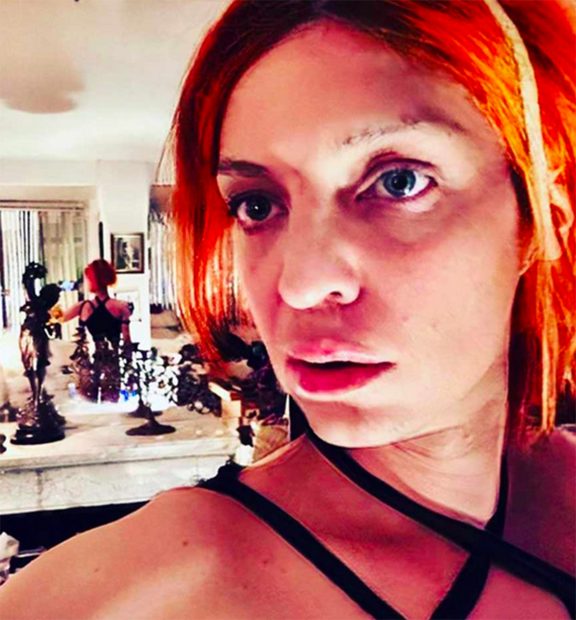 En una de las imágenes aparece mirando al objetivo de la cámara con una peluca roja y una especie de bañador con cuello halter mostrando también su parte trasera al descubierto. Pero eso no ha sido todo, porque en otra estampa aparece con la mirada perdida en el salón de su casa.