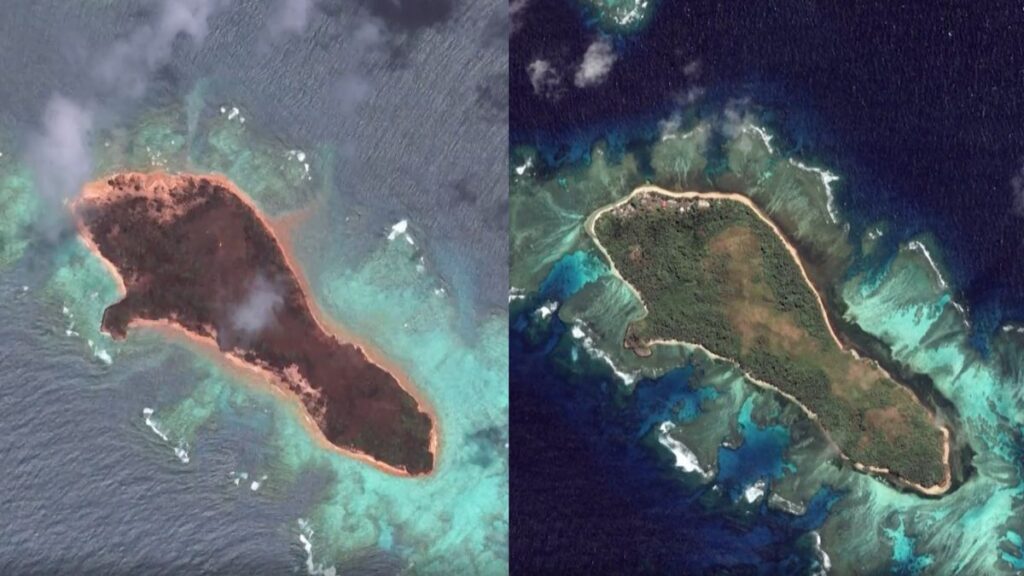 Las islas de Mango y Nomuka (Tonga) han perdido su vegetación tras la erupción del volcán submarino Hunga Tonga-Hunga Ha’apai. Las imágenes captadas por satélite, que acompañan esta noticia, muestran cómo era el terreno en dos fechas diferentes: con una frondosa vegetación en agosto de 2020 y completamente devastado y cubierto de ceniza el 20 de enero de 2022.