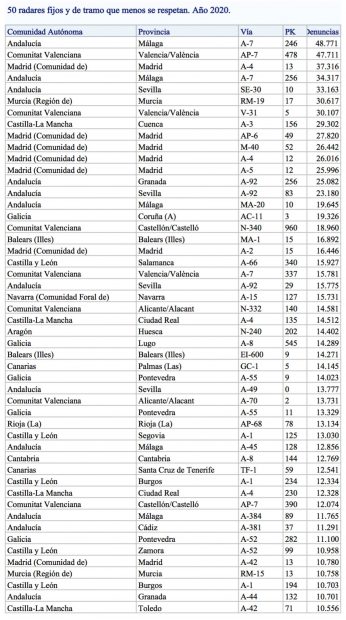 Mirando la lista, el radar más multón de 2020 está situado en Málaga, concretamente en la A-7, en el kilómetro 246 a la altura de la localidad de El Palo. Lo curioso es que este mismo radar en 2019 estaba situado en el puesto número 50 en cuestión de multas, y en este 2020 ha sido el que más infracciones ha denunciado con un total de 48.771 demandas.