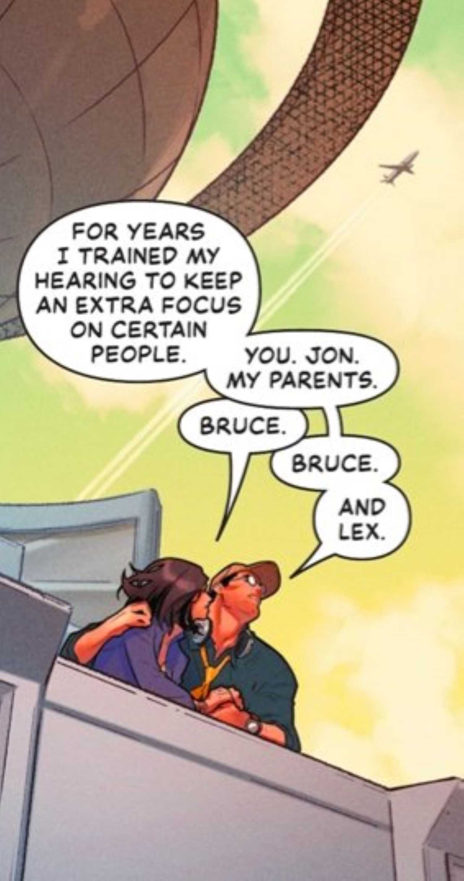 Durante este momento, dice Clark, “Durante años entrené en mi audición para mantener un enfoque adicional en ciertas personas. Usted. Jon. Mis padres”. Lois luego interrumpe para agregar a Bruce a la lista, con Clark de acuerdo e incluido Lex también. Esto les da a los lectores una lista confirmada, aunque no completa, de personas cuyas voces La audiencia de Clark está específicamente sintonizada, con Lex Luthor notablemente incluida.