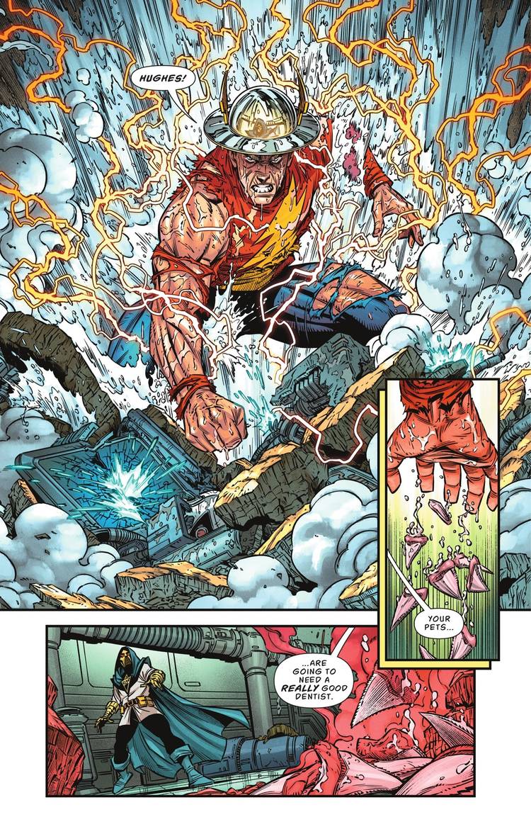 Jay Garrick: El flash El número 6 está escrito por Jeremy Adams y dibujado por Diego Olortegui. Jay corre hacia una pequeña isla en el Atlántico. Esta isla es la guarida secreta del Doctor Elemental. El Doctor Elemental, el antiguo mentor de Jay Garrick, mantiene como rehén a la hija de Jay, Judy, y planea usar su poder para ayudarlo a impulsar sus planes de conquista. Cuando Jay se acerca a la isla, es abordado por un grupo de tiburones mecánicos. Luego, la acción vuelve a la sala de control de Elemental.