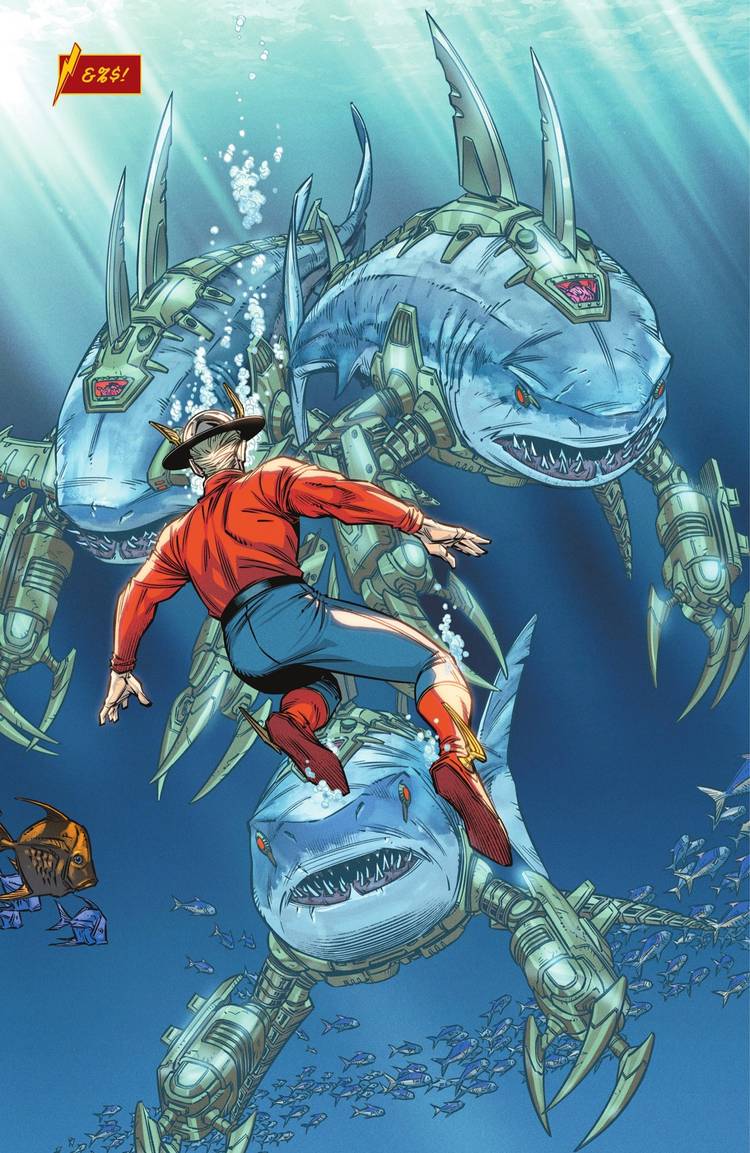 -   Jay Garrick demuestra que es el luchador de primer nivel de la familia Flash al enfrentarse a mecha-tiburones con una eficiencia brutal.