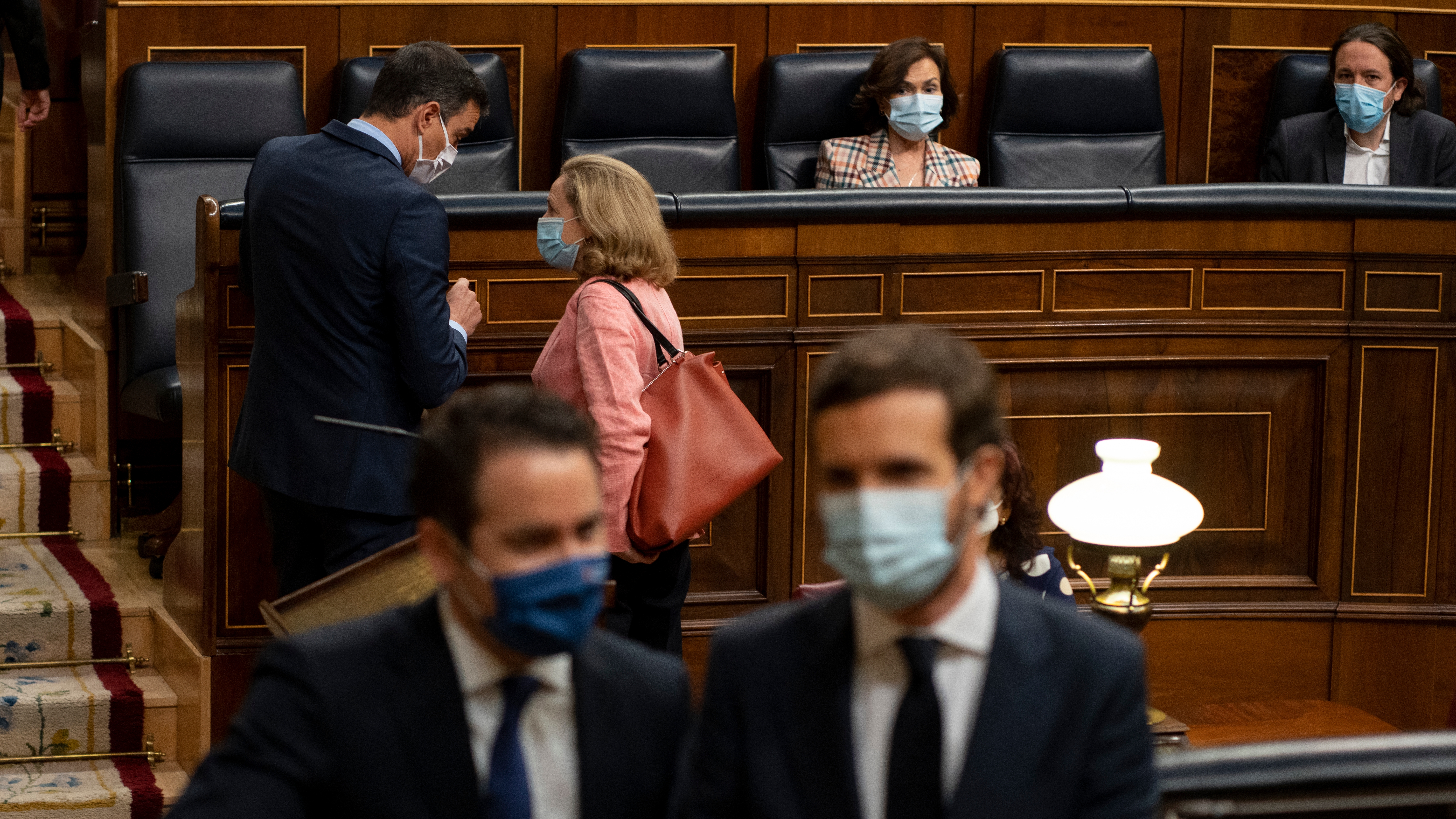 En primer término, Teodoro García Egea (izquierda) y Pablo Casado. Al fondo, Pedro Sánchez charla con Nadia Calviño, a finales de diciembre en el Congreso.Ignacio Gil / Pool