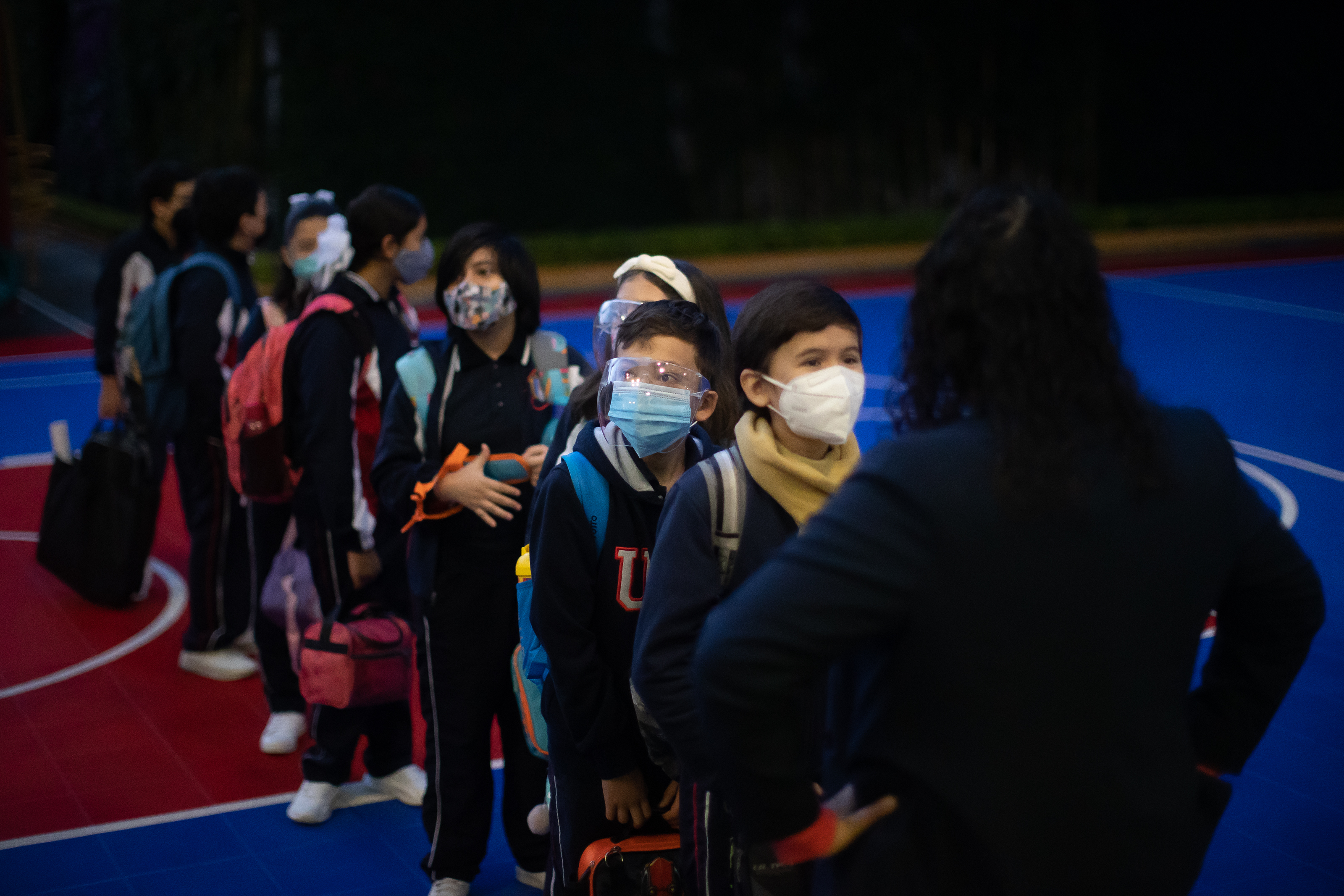 Un grupo de niños hace fila para entrar a su escuela, en Ciudad de México, en agosto de 2021.Eloisa Sanchez de Alba (Getty Images)