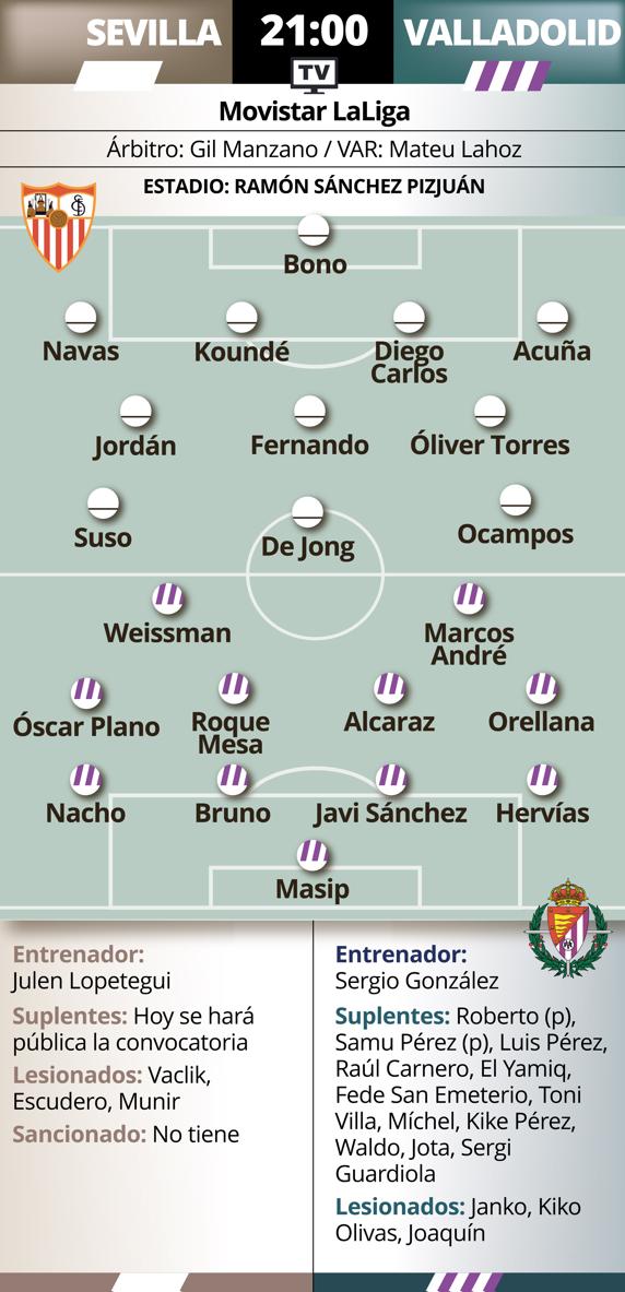 Mientras, el Valladolid, cuarto por la cola con 13 puntos, a sólo dos de unos puestos de descenso que abandonó merced a su reacción en las últimas jornadas, llega a Sevilla sin dos puntales en su zaga, el central almeriense Joaquín Fernández y el lateral derecho suizo Saidy Janko, con problemas físicos de distinto alcance.