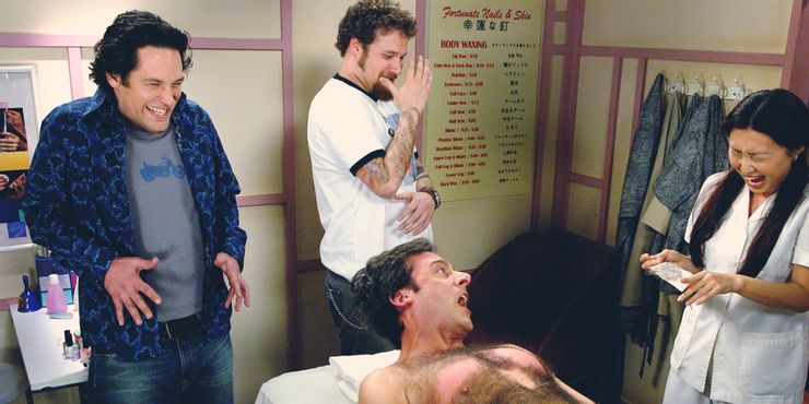 Los compañeros de trabajo de Andy, David (Paul Rudd, viviendo contigo mismo), Jay (Romany Malco), Cal (Seth Rogen) y Mooj (Gerry Bednob) prometen ayudarlo a perder su V-card. Sin embargo, al ser ellos mismos bastante disfuncionales, sus consejos a menudo están equivocados. Caso en cuestión: la sugerencia de Jay de que Andy se someta a una dolorosa depilación en el pecho para deshacerse de “todo eso de Teen Wolf“Él está pasando. La escena resultante ve al pobre Andy con mechones de pelo ceroso arrancados de su pecho mientras suelta una serie de palabrotas y palabras hilarantes que no son maldiciones para hacer frente, incluido gritar el nombre de Kelly Clarkson en un punto, que aparentemente fue idea de Seth Rogen.