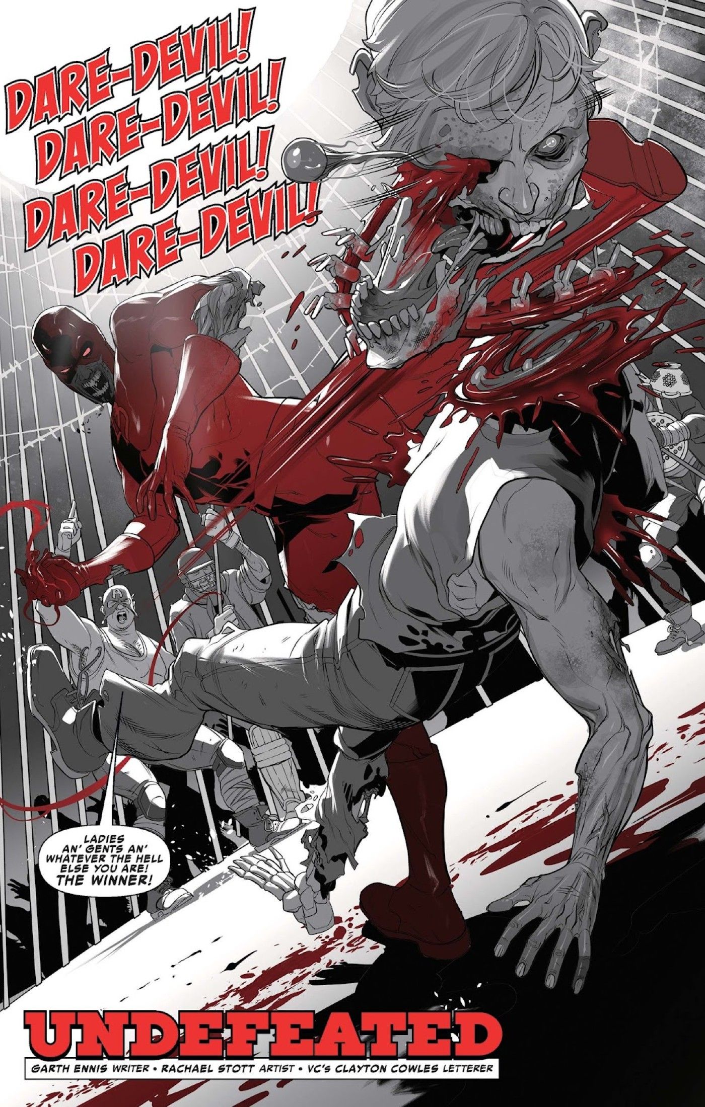 Marvel Zombies: negro, blanco y sangre El número 1 presentó un destino verdaderamente horrible para Black Widow, ya que apareció brevemente en la historia “Undefeated”, de Garth Ennis, Rachael Stott y Clayton Cowles de VC, donde se ve obligada a pelear con el hombre zombificado sin miedo, Daredevil. Desafortunadamente, Natasha sale perdiendo de la peor manera.