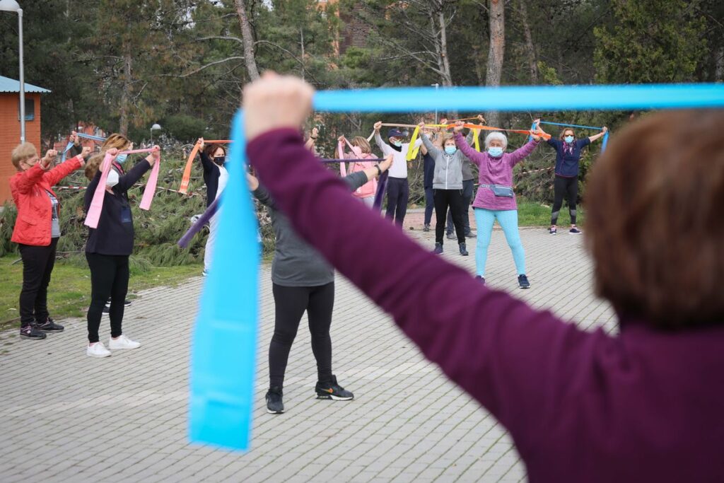 Usuarios de centros de día del barrio de Santa Eugenia, en Madrid, realizan ejercicio físico en el parque de su zona el pasado marzo.KIKE PARA