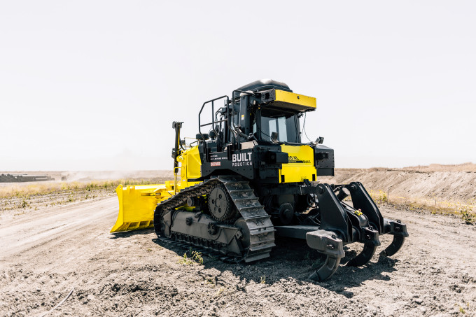 Mostraron esta tecnología en una escala más pequeña por primera vez en 2017, implementándola en el cargador de pistas compacto que se muestra arriba. Ahora se está expandiendo a equipos más grandes, incluyendo topadoras (en la foto de abajo) y excavadoras (en la parte superior). ¿Ves esas cajas negras encima de cada vehículo? Ahí es donde vive toda la tecnología de Built.