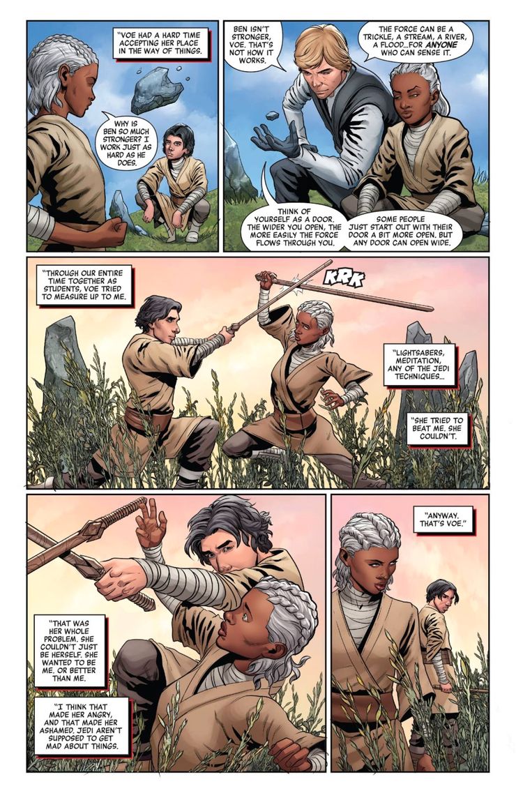 Durante un flashback de Los días de Luke Skywalker en el Jedi escuela de formación, anima a un joven padawan, diciendo: Ben no es más fuerte, Voe. Así no es cómo funciona. La Fuerza puede ser un goteo, un arroyo, un río, una inundación… para cualquiera que pueda sentirlo. Piensa en ti mismo como una puerta. Cuanto más te abras, más fácilmente fluirá la Fuerza a través de ti. Algunas personas simplemente comienzan con la puerta un poco más abierta. Pero cualquier puerta puede abrirse de par en par”. Aunque el Maestro Jedi hace referencia a que su apellido viene con privilegios y bagaje, no deja que Voe asuma que el linaje Skywalker es inherentemente propenso a la sensibilidad a la Fuerza. En cambio, Luke proporciona matices a la forma en que la Fuerza puede funcionar, ya que algunas personas tienen una ventaja.