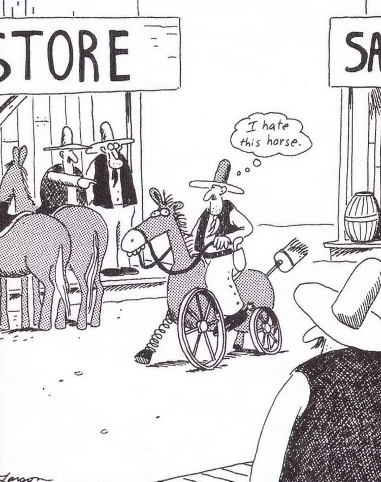 Mientras que uno asumiría que esto significa simplemente tomar el caballo, Larson aplica su absurdo que define el cómic imaginando que las piernas del caballo han sido robadas, y representa el caballo ahora sin piernas con su cuerpo descansando sobre bloques de ceniza, al igual que cómo descansaría un automóvil después de que sus neumáticos fueran robados.