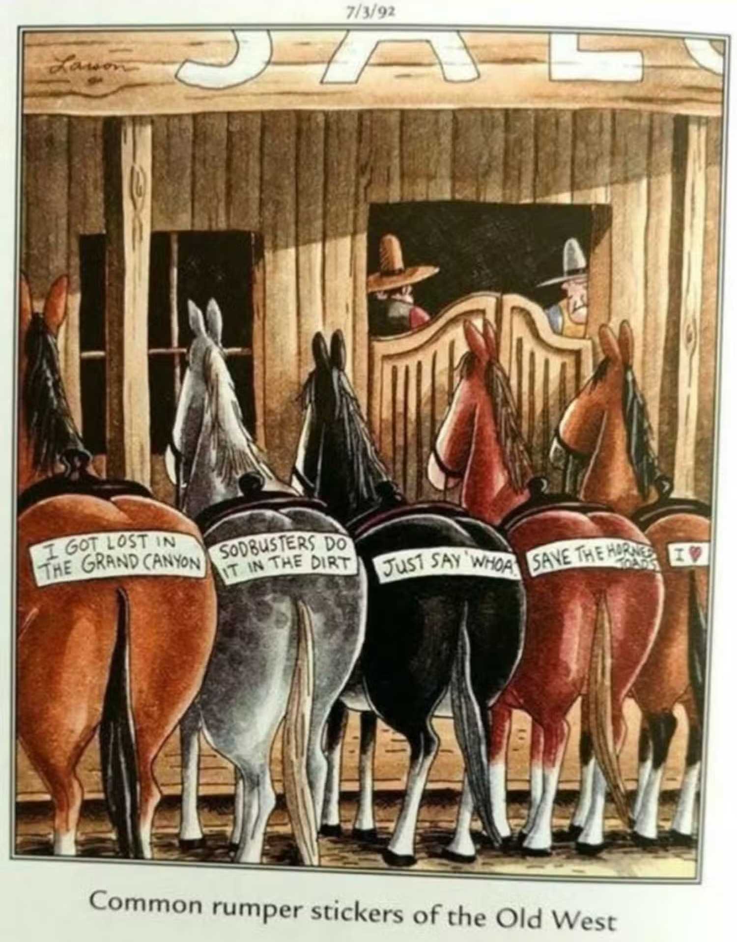 Reemplazando los autos con caballos, Larson nos da “Pegatinas Rumper del Viejo Oeste”. En lugar de los parachoques, los consignas se abofeten en los cargos de los caballos, cada una broma adaptada a un entorno occidental. De “Solo di Woah” a “Guarda los sapos con cuernos” El absurdo es perfecto. Es una colisión perfecta de la estética antigua y la calcomanía moderna.