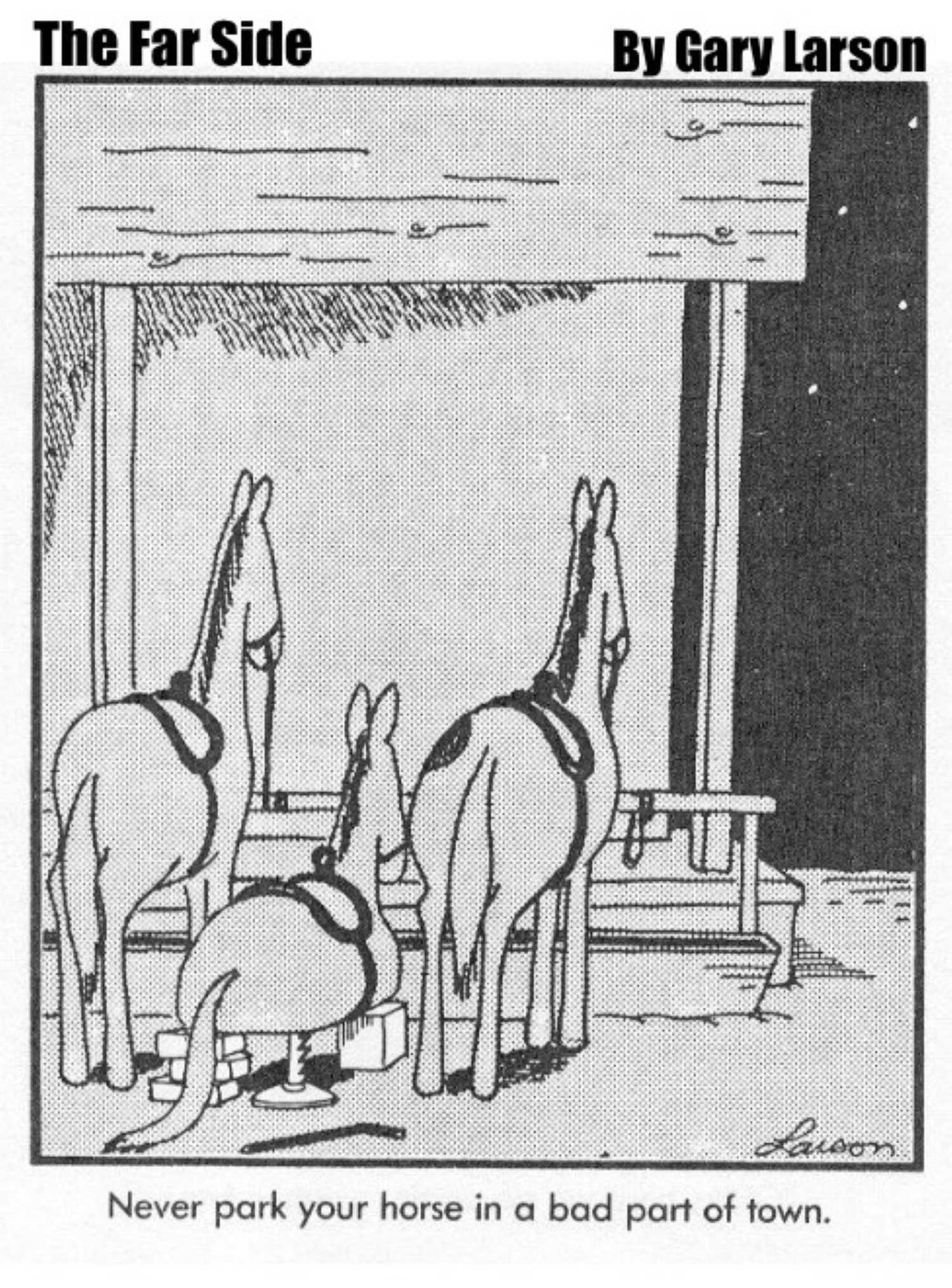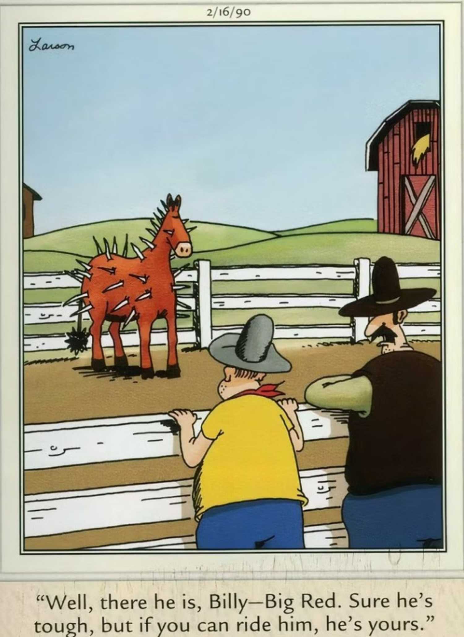Este cómic protagonizado por los caballos ve Larson burlándose de un tropo occidental común que se ha convertido desde hace mucho tiempo en un cliché: El niño puede mantener el caballo insultable si puede domesticarlo. El subtítulo de la tira dice, “Bueno, ahí está, Billy. Big Red. Claro, es duro, pero si puedes montarlo, él es tuyo”.