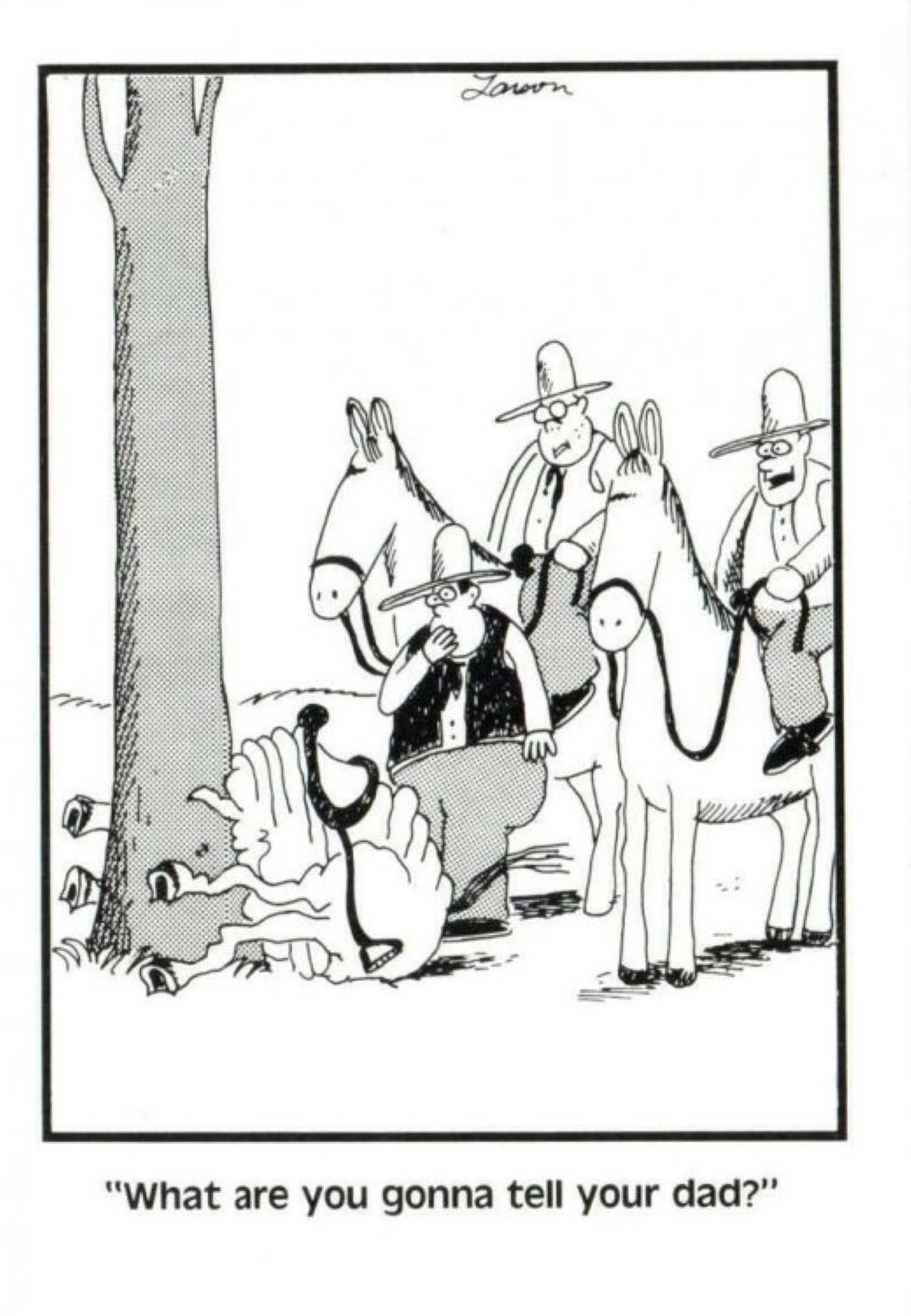 Este Lado lejano Comic pone otro giro occidental en una experiencia humana que esperamos que no muchos de nosotros hemos tenido: Envolviendo el auto de papá alrededor de un árbol. Pero como es el Wild West, no es un auto que se ha estrellado, es un caballo, con el hermano del jinete “útilmente” preguntando, “¿Qué vas a decirle a papá?”