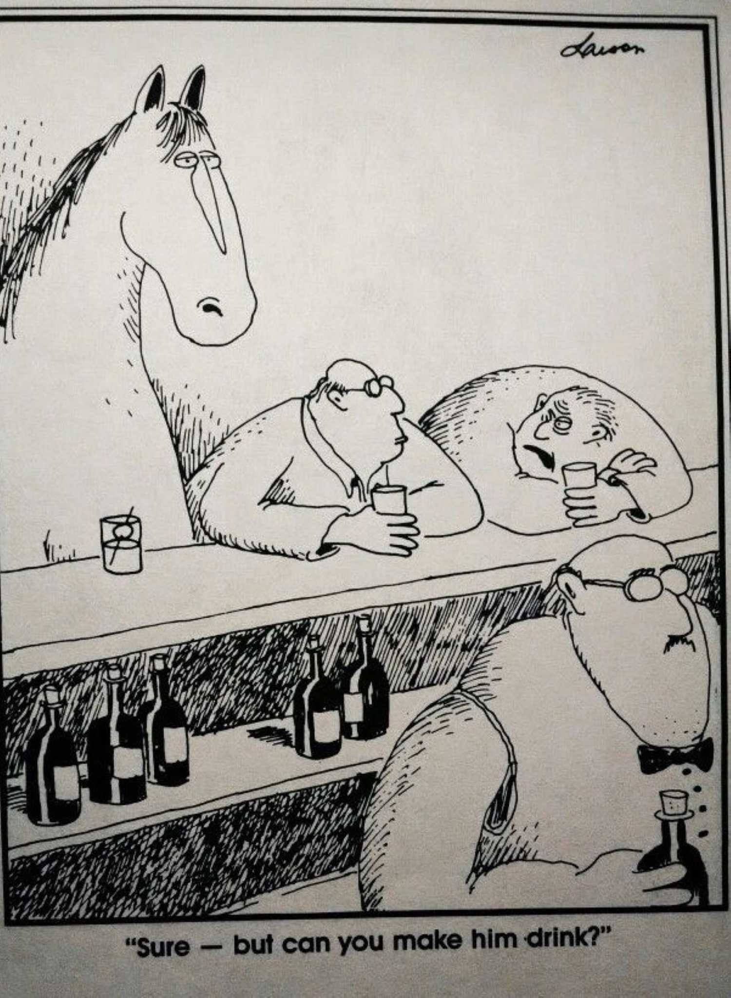 El humor en esta tira se encuentra tanto en la leyenda como en lo visual, donde un caballo se sienta en un bar con una cara larga, mientras que un patrón humano dice al otro, “Claro, pero ¿puedes hacerle beber?” Es una obra inteligente en un dicho tan familiar que prácticamente se ha convertido en un cliché, uno Larson revive con ingenio perfectamente seco.
