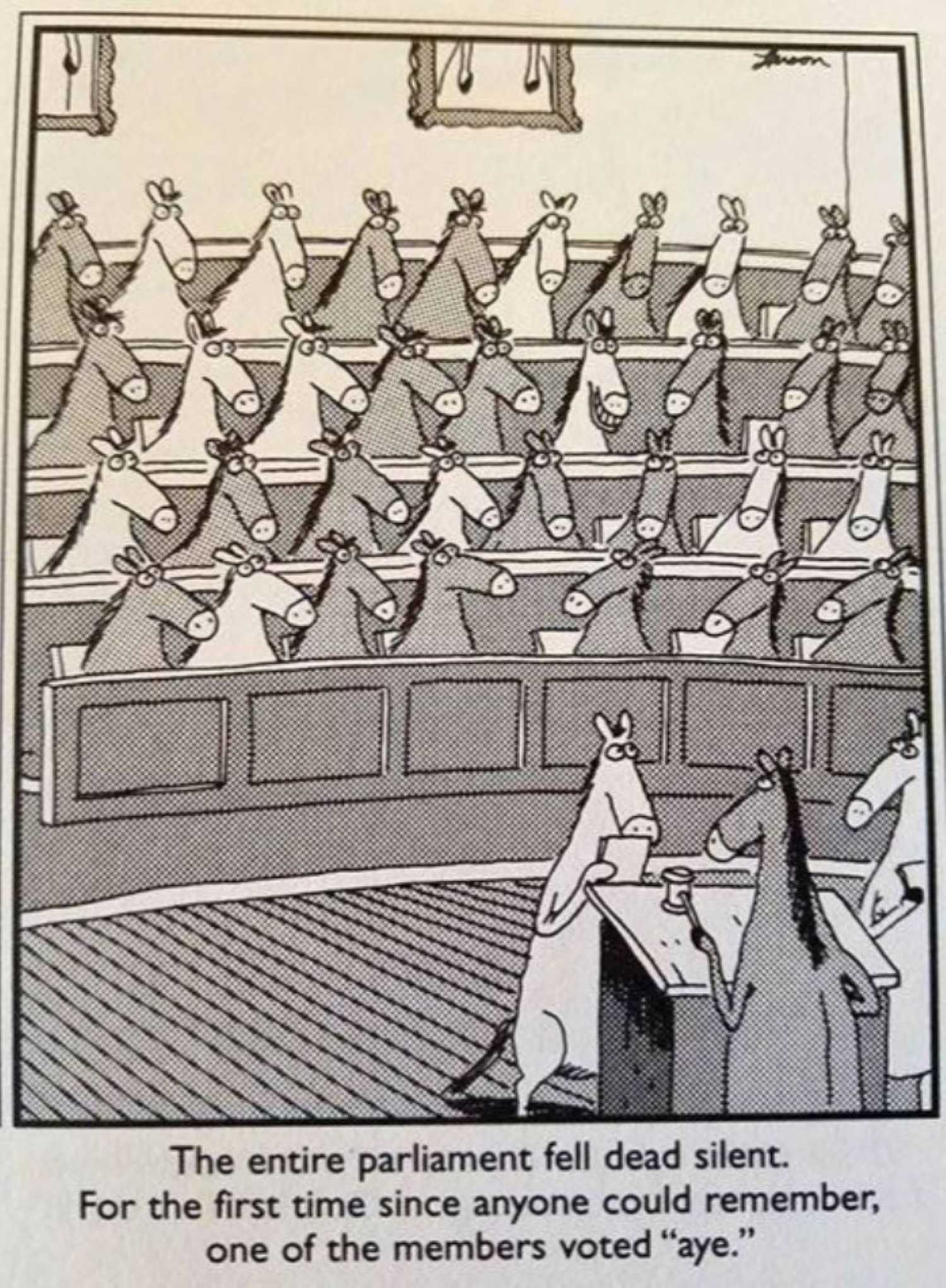 ¿Qué es lo contrario de lo afirmativo? “sí”? No, que suena como “relinchar.” El humor aquí radica en el hecho de que El parlamento del caballo siempre ha votado en lo negativo, simplemente porque ese es el sonido que hacen los caballos. Entonces, para que uno de ellos vote “sí” es un giro impactante e hilarante en el Lado lejano universo.