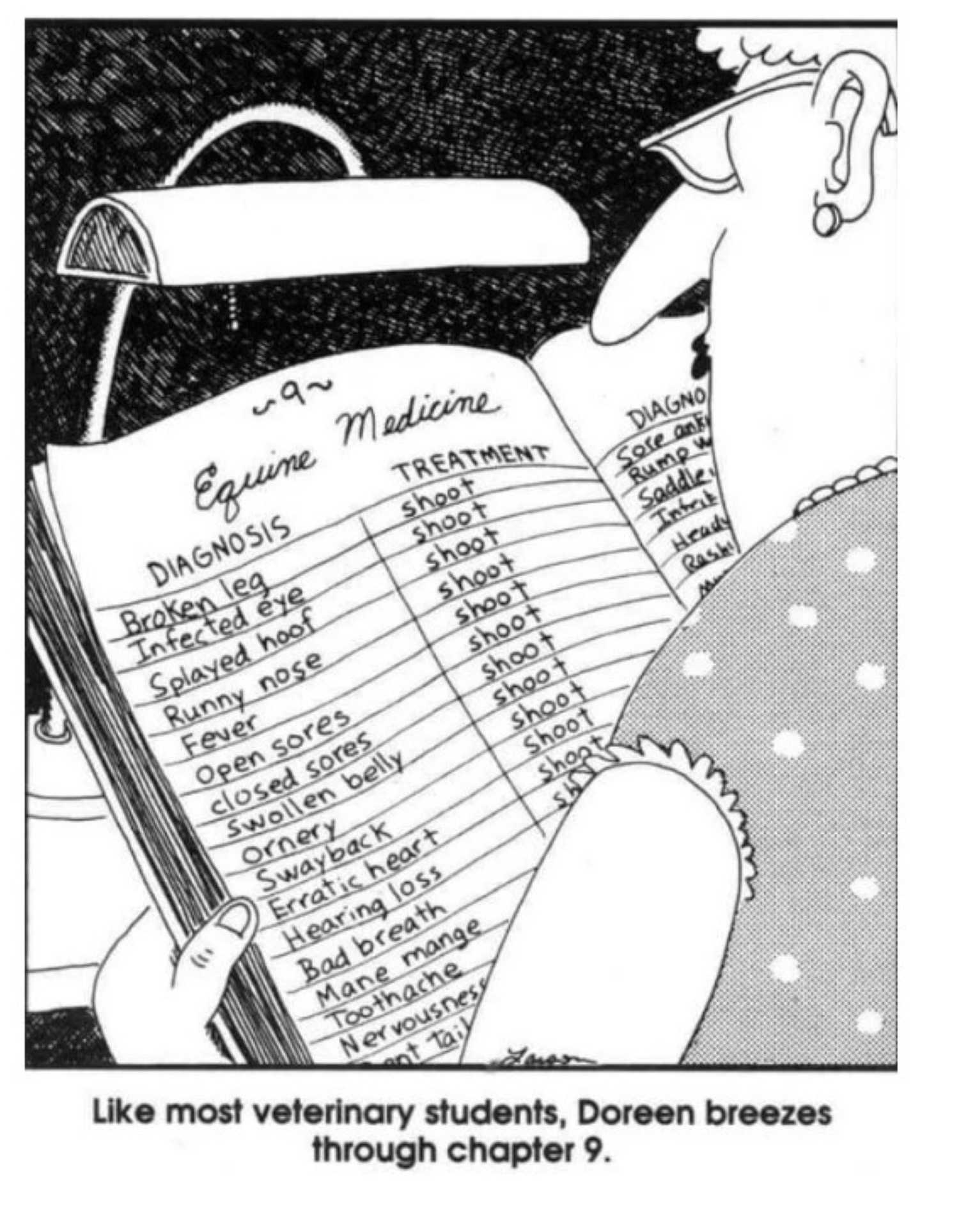 Para terminar esta lista, estamos volviendo a tocar el humor increíblemente oscuro de Larsondonde revisa las prácticas de medicina de caballos. Aquí, el subtítulo dice: “Como la mayoría de los estudiantes veterinarios, Doreen brisa a través del capítulo 9”, El capítulo se centra en la medicina de los caballos, donde enumera varias dolencias y lesiones, seguido de las mejores prácticas en el tratamiento de dichos problemas.