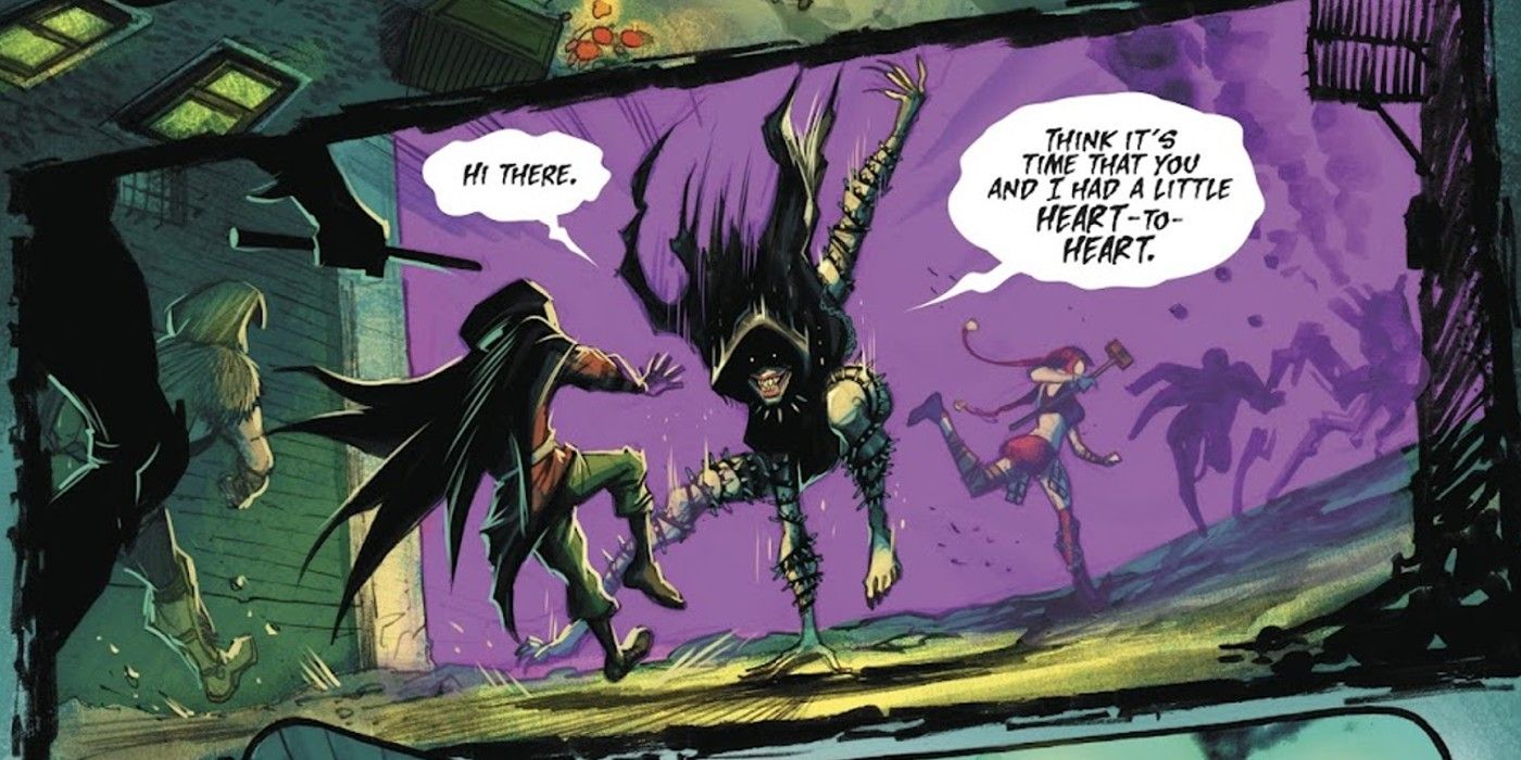 La versión Batman Who Laughs de Batman es un asesino en serie brutal y sádico que felizmente mata a toda su familia, excepto a Damian. Si bien las circunstancias por las que Damian se unió a él no están claras, Batman Who Laughs afirma que Damian lo eligió principalmente por su cuenta.