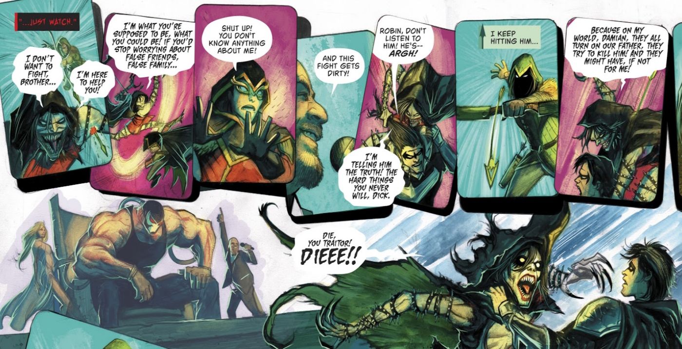 - Damian se une voluntariamente al malvado Batman Who Laughs, mostrando su lealtad irreflexiva hacia su padre.