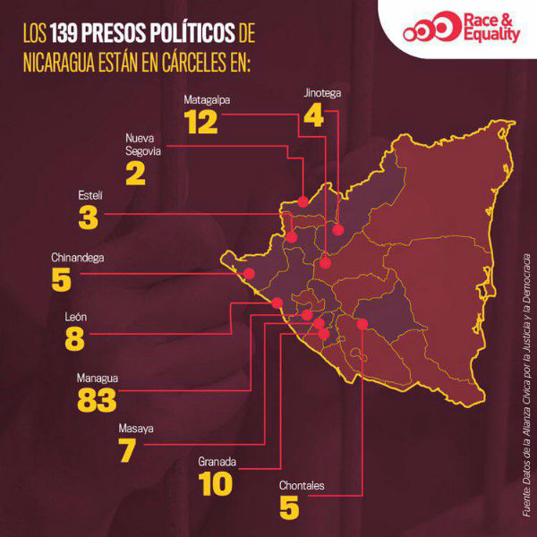 Según la base de datos construida para esta investigación periodística de Onda Local, basada en las notas de prensa oficiales, al menos 251 personas de mil 900 detenidos entre mayo de 2018 y julio de 2019 fueron apresados por su participación directa en las protestas. Fueron remitidos a 10 de 15 departamentos del país centroamericano: Masaya, Managua, Carazo, Rivas, León, Chinandega, Chontales, Matagalpa, Jinotega y Nueva Segovia. También detuvieron en la Región Autónoma del Caribe Norte que tiene una categoría diferente a la departamental según la división administrativa del país.