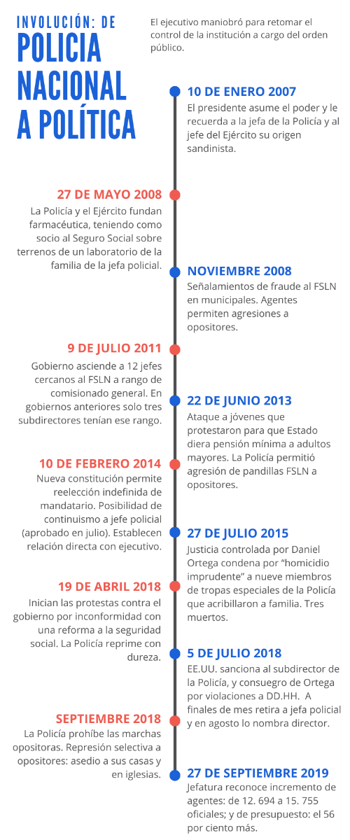 Para la socióloga Elvira Cuadra, investigadora nicaragüense en temas de seguridad, la actuación de la Policía Nacional no corresponde con los parámetros de un cuerpo profesional, sino “a un aparato armado que responde a intereses específicos del grupo Ortega-Murillo”, refiriéndose al gobernante y su esposa y vicepresidenta Rosario Murillo. La especialista ha criticado la involución institucional de la Policía desde el ascenso de Ortega al poder al recordar que, aunque fue fundada en los años de la revolución sandinista, después de 1990 inició un proceso de fortalecimiento institucional pasando de ser “sandinista” a “nacional”. Luego todo cambió y se politizó.